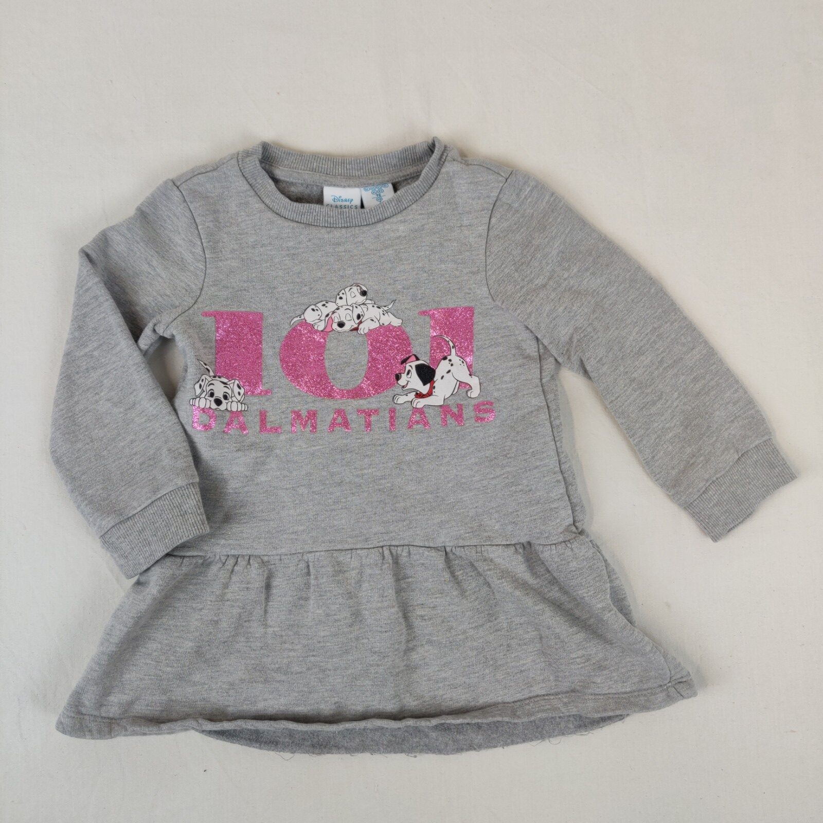 Autres commentaires : 7% polyester. Sweat – gris clair chiné. Motifs centraux 101 dalmatiens. Taille marquée. Usure normale.