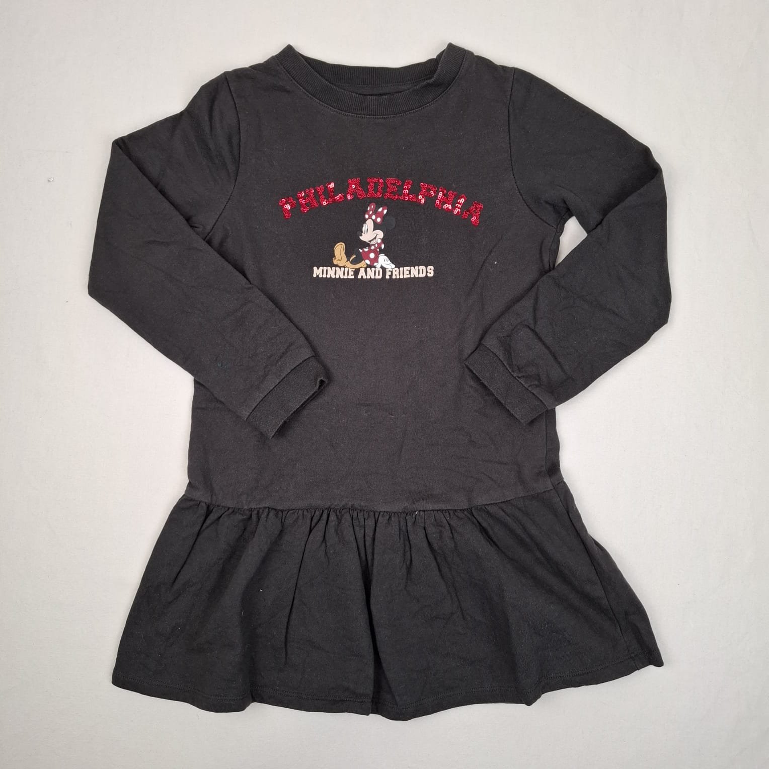 Autres commentaires : Sweat en polaire gris foncé, inscription « Philadelphia » rose en sequins, « Minnie and friends » et motif Minnie Mouse, col rond, volant en bas.