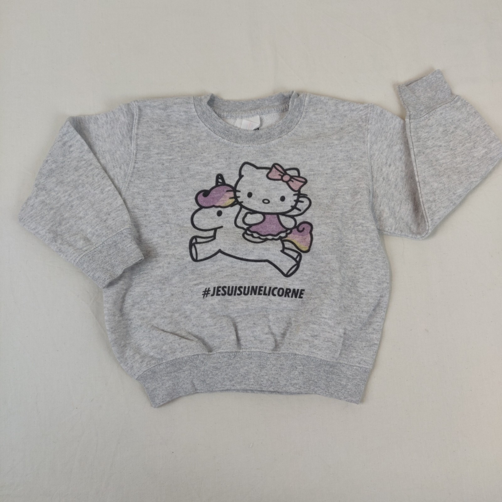 Autres commentaires : 20% polyester. Sweat – gris chiné. Motif central Hello Kitty chevauchant une licorne accompagné de l’inscription « #jesuisunelicorne ».