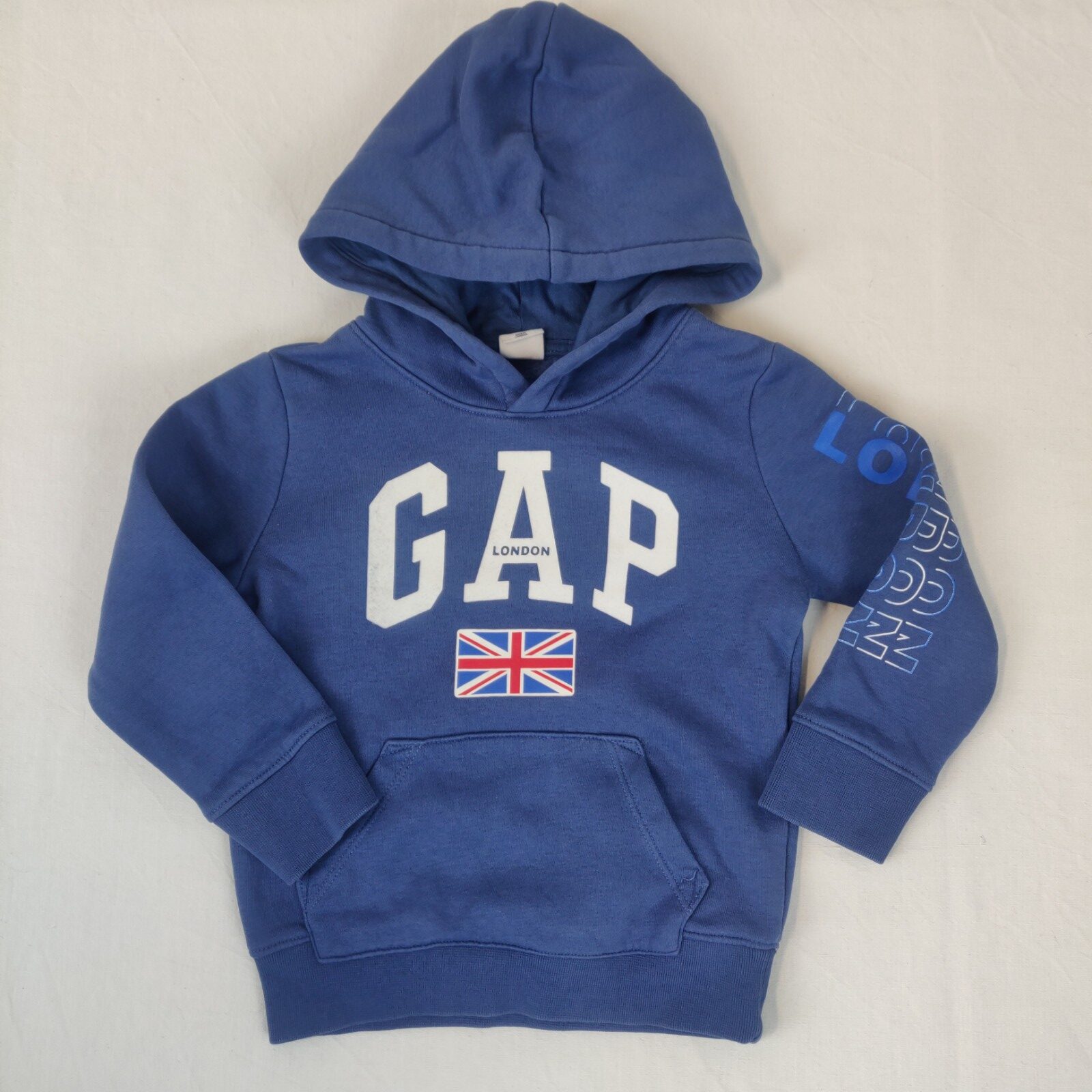 Autres commentaires : Sweat à capuche – bleu. Inscription centrale GAP London accompagnée du drapeau anglais. Inscription « London » sur la manche gauche. Double poche centrale.
