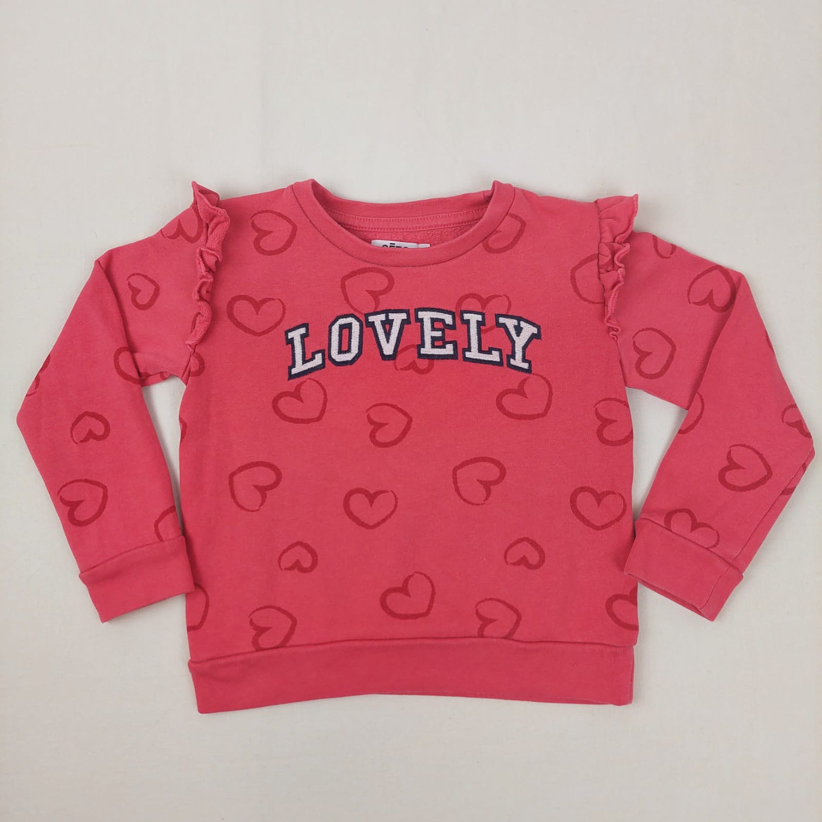 Autres commentaires : Sweat rouge imprimé coeur, « LOVELY » brodé, volanté aux épaules