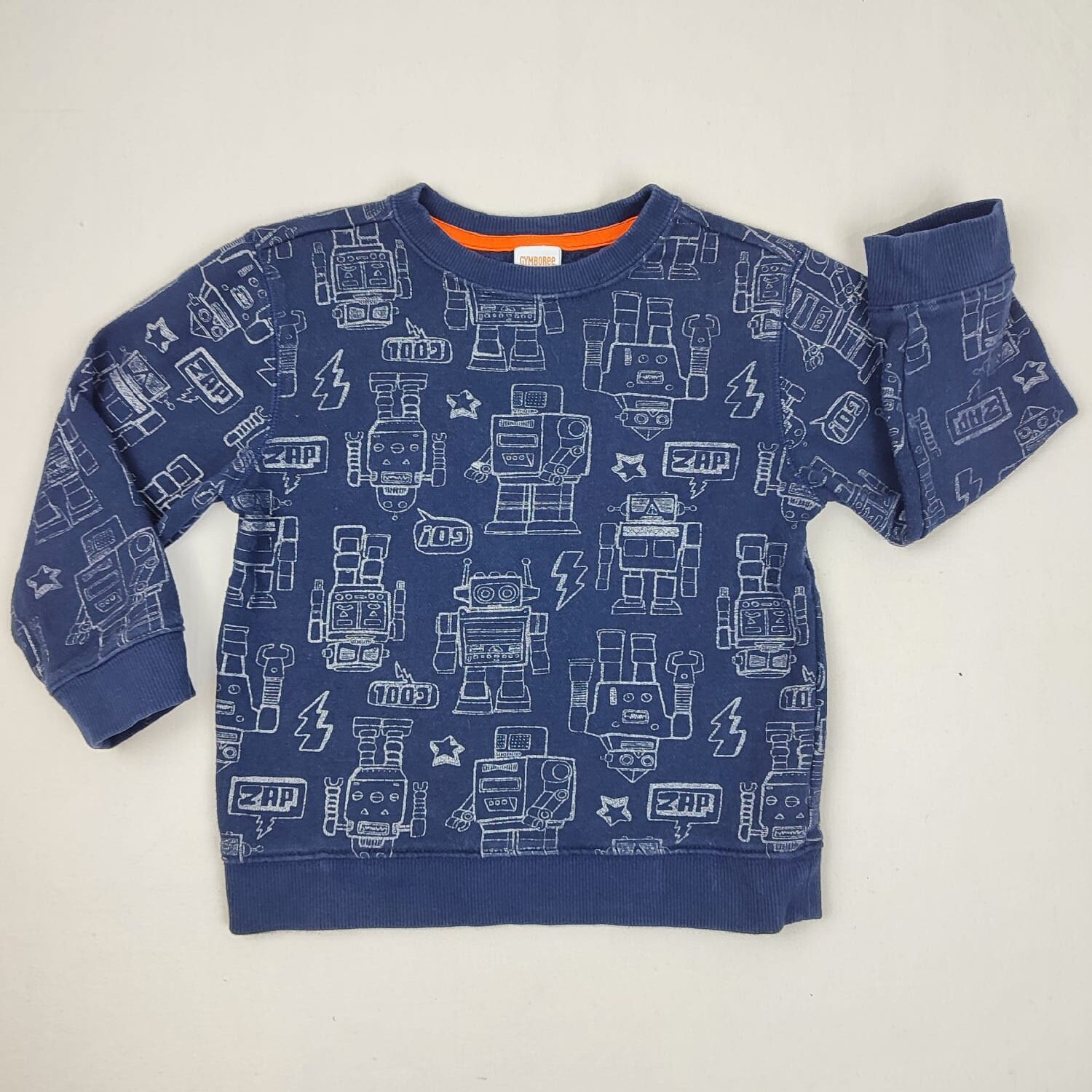 Autres commentaires : 40% polyester – Sweat bleu foncé avec motifs robots argentés, col rond.
