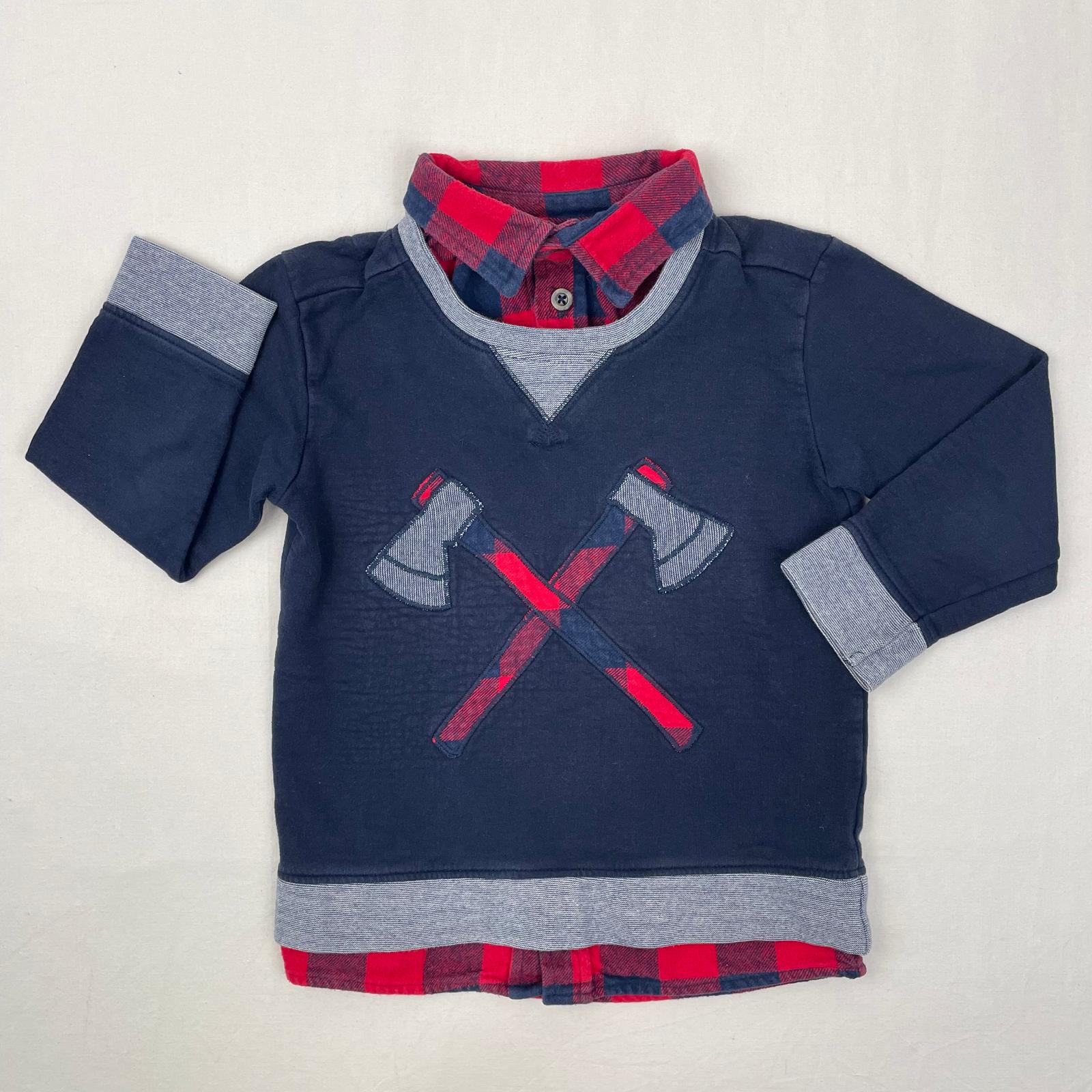 Autres commentaires : Sweat bleu foncé avec effet superposition chemise épaisse canadienne à carreaux rouges et bleu marine, devant motifs haches croisées avec rappel du tissu de la partie chemise au niveau des manches, garniture 95% coton et 5% élasthanne.