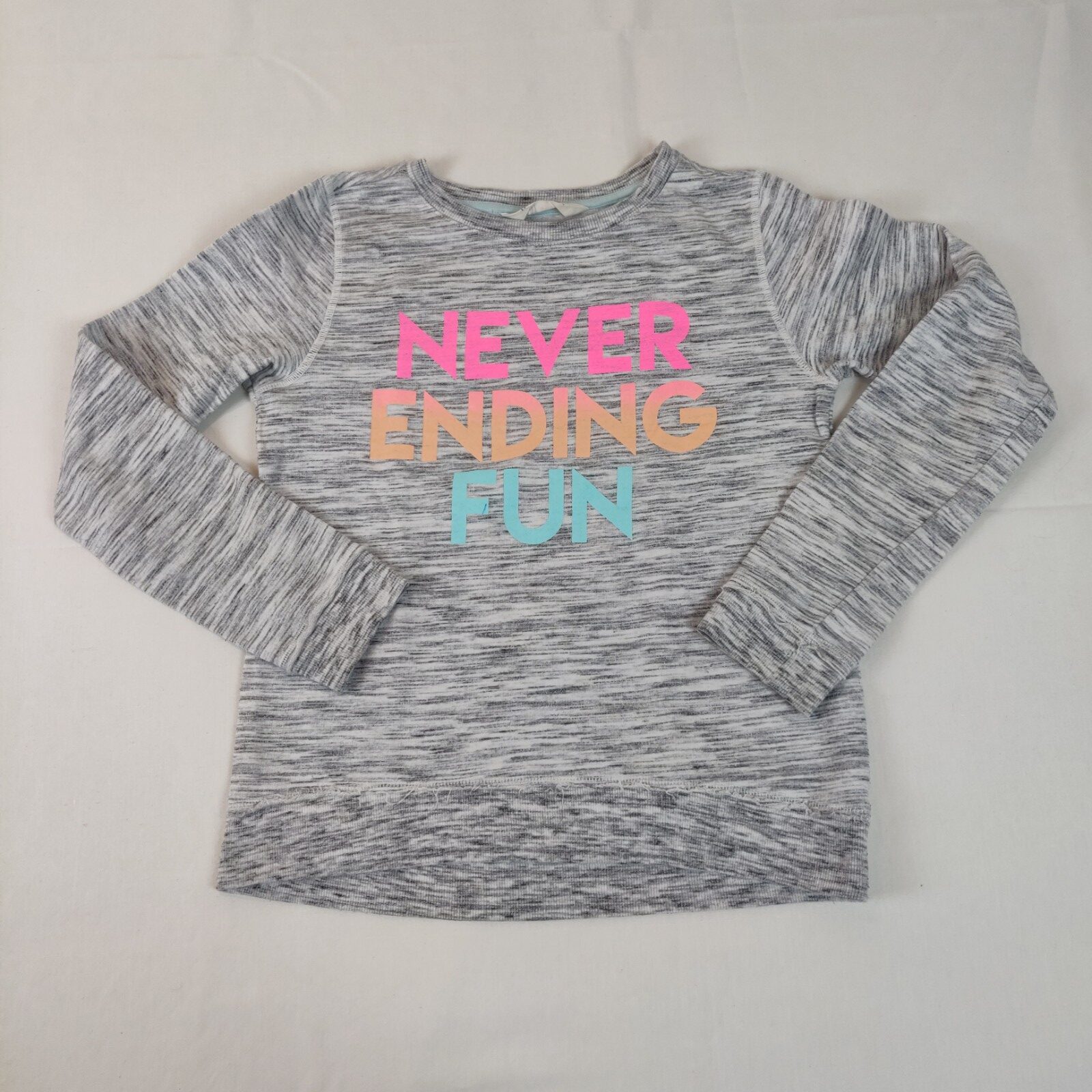 Autres commentaires : 31% polyester. Sweat gris chiné avec inscription en couleurs vitaminées « Never Ending Fun » avec petite tâche de feutre sur le « F ».