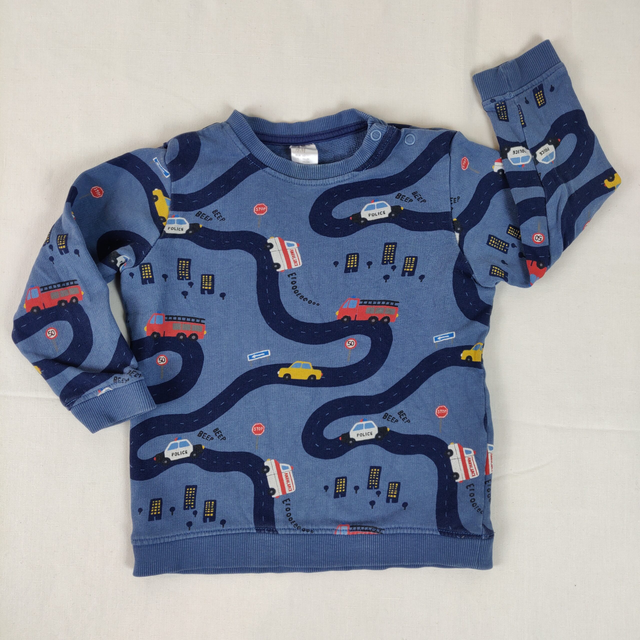 Autres commentaires : Sweat – bleu avec imprimé mulitcolore circuit petites voitures – ouverture latérale à partir du col à 2 boutons pression. Col, poignets, taille élastiques façon tricot. Légère tâche sur le col.