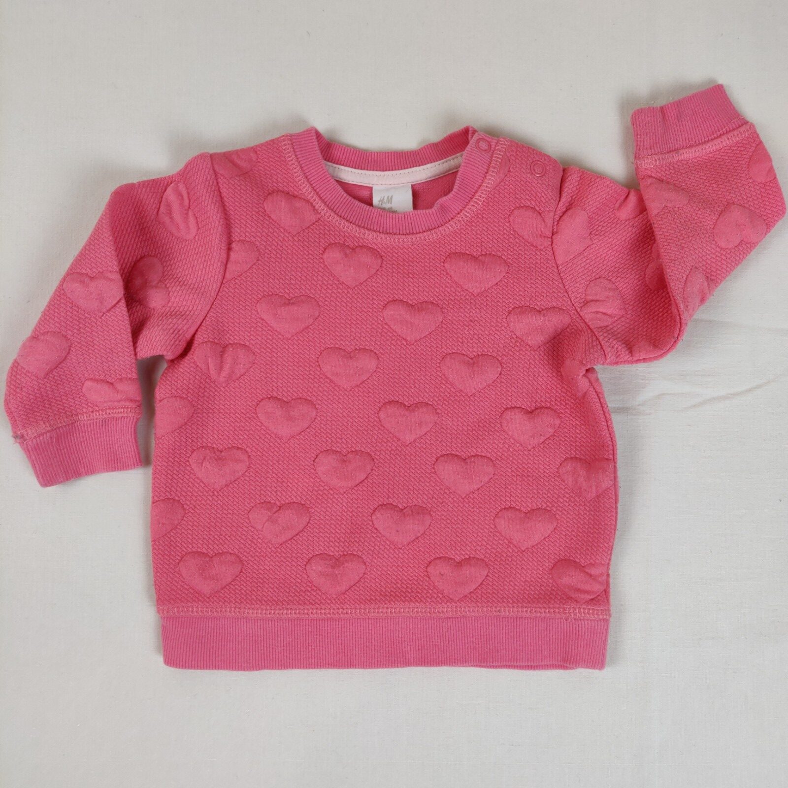 Autres commentaires : 16% viscose, 2% élasthanne. Sweat rose à motifs coeurs en relief. Col rond. Ouverture latérale à 2 boutons pression. Effet pelucheux.