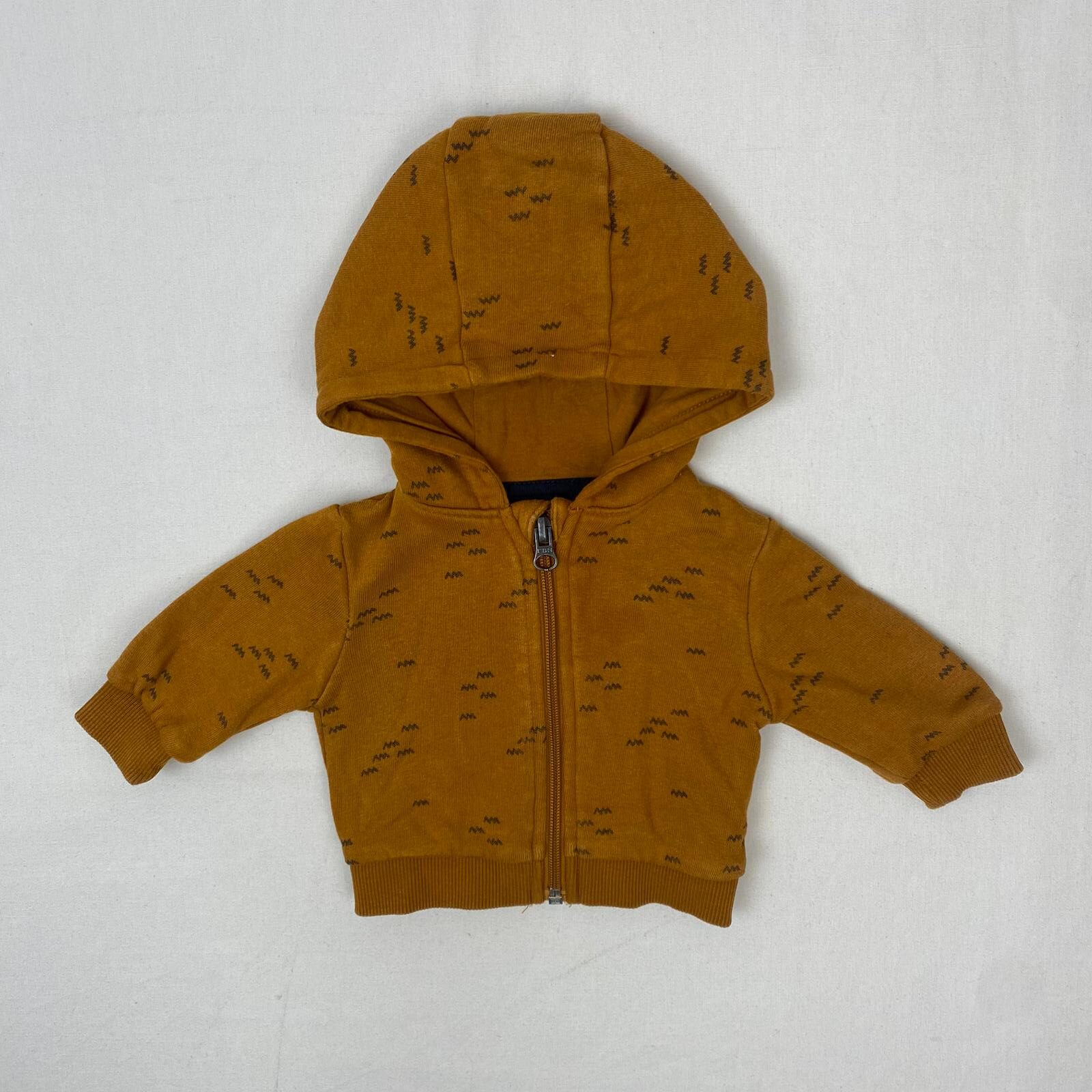 Autres commentaires : Sweat à capuche couleur crème, fermeture par zip, parsemé de petits zigzags noirs.
