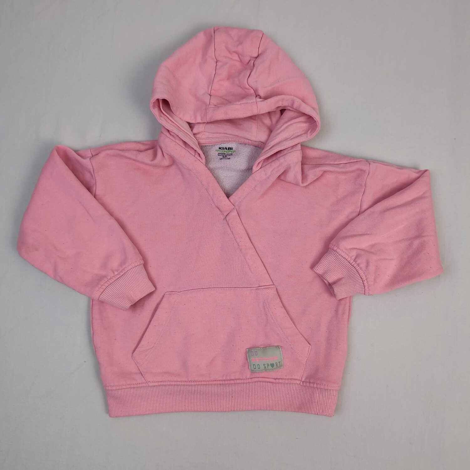 Autres commentaires : 30% polyester recyclé – Sweat rose saumon à capuche Kiabi, manches longues, double poche ventrale, gamme Eco-conception.