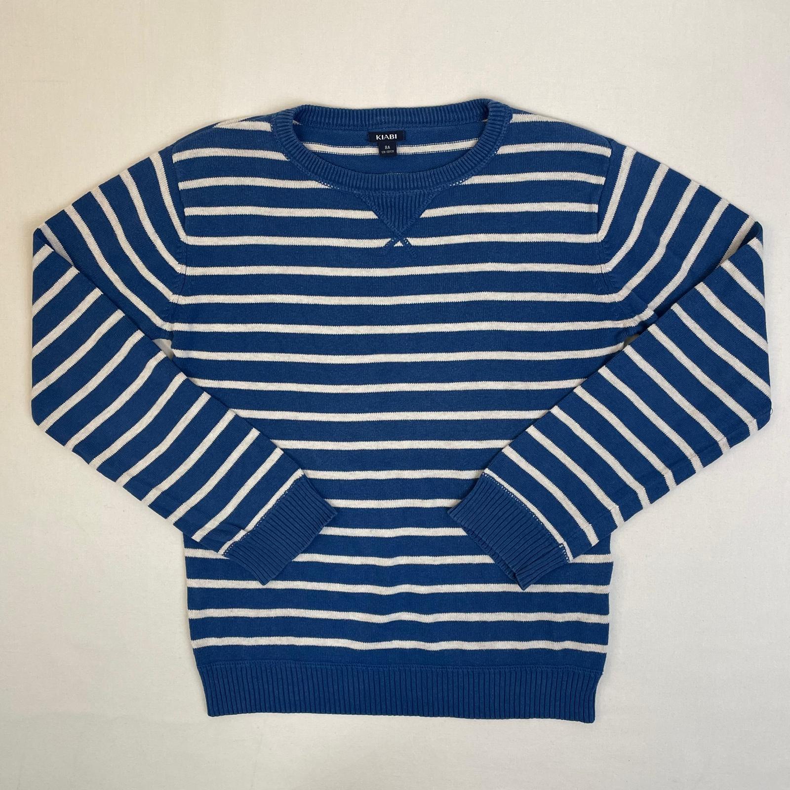 Sweat bleu à rayures blanches; col, poignets et bas élastiques.