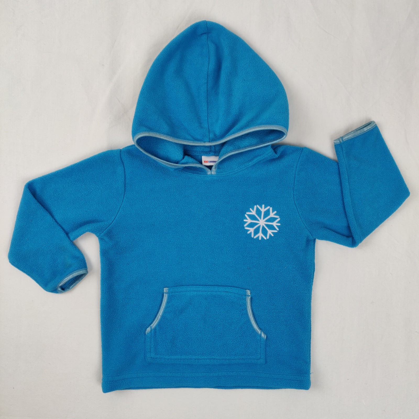 Autres commentaires : Sweat bleu en polaire avec capuche et une poche kangourou.