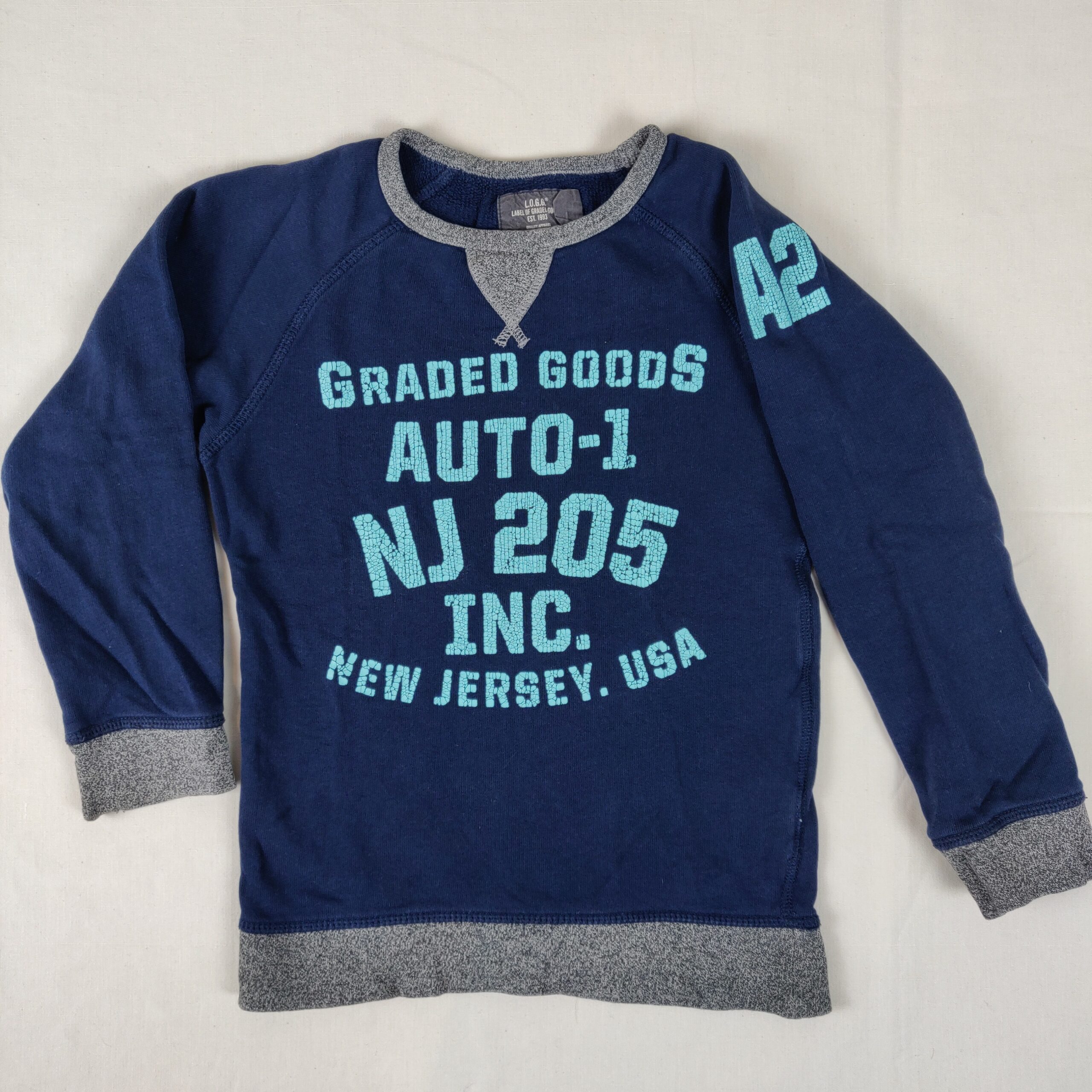 Autres commentaires : Sweatshirt bleu marine, poignets et col gris chiné, avec inscriptions turquoises style craquelé Graded goods, New Jersey. USA.