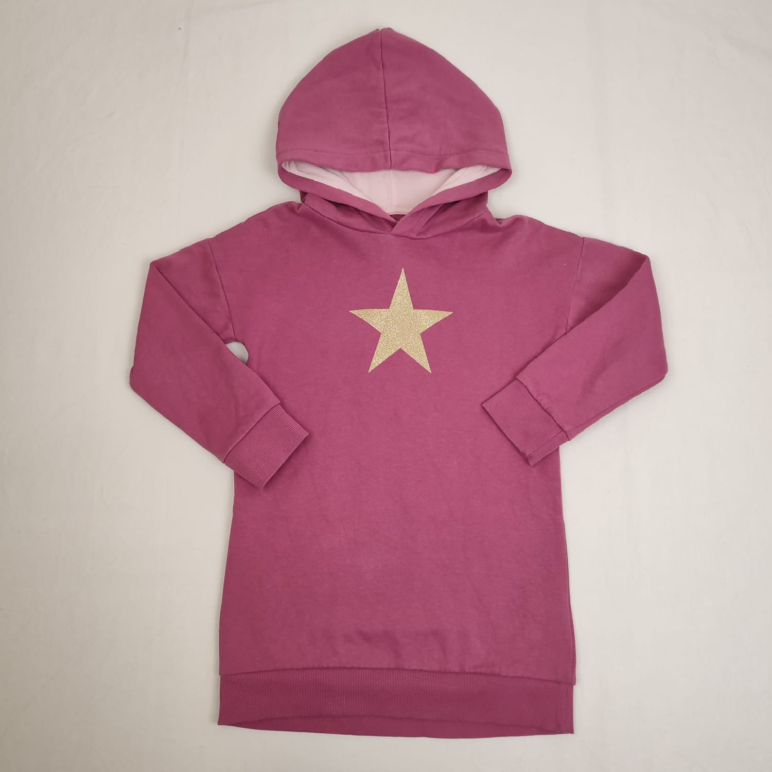 Autres commentaires : 40% polyester. Sweat à capuche manches longues bordeaux, doublure de la capuche en jersey rose clair, motif étoile dorée, poignets et bas côtelés et élastiiqués.