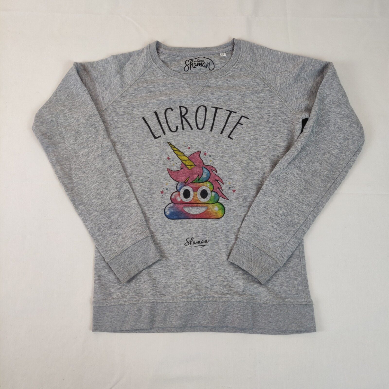 Autres commentaires : Coton biologique, 15% polyester. Sweat (taille XS) – gris chiné – avec motif coloré et inscription « Licrotte ».