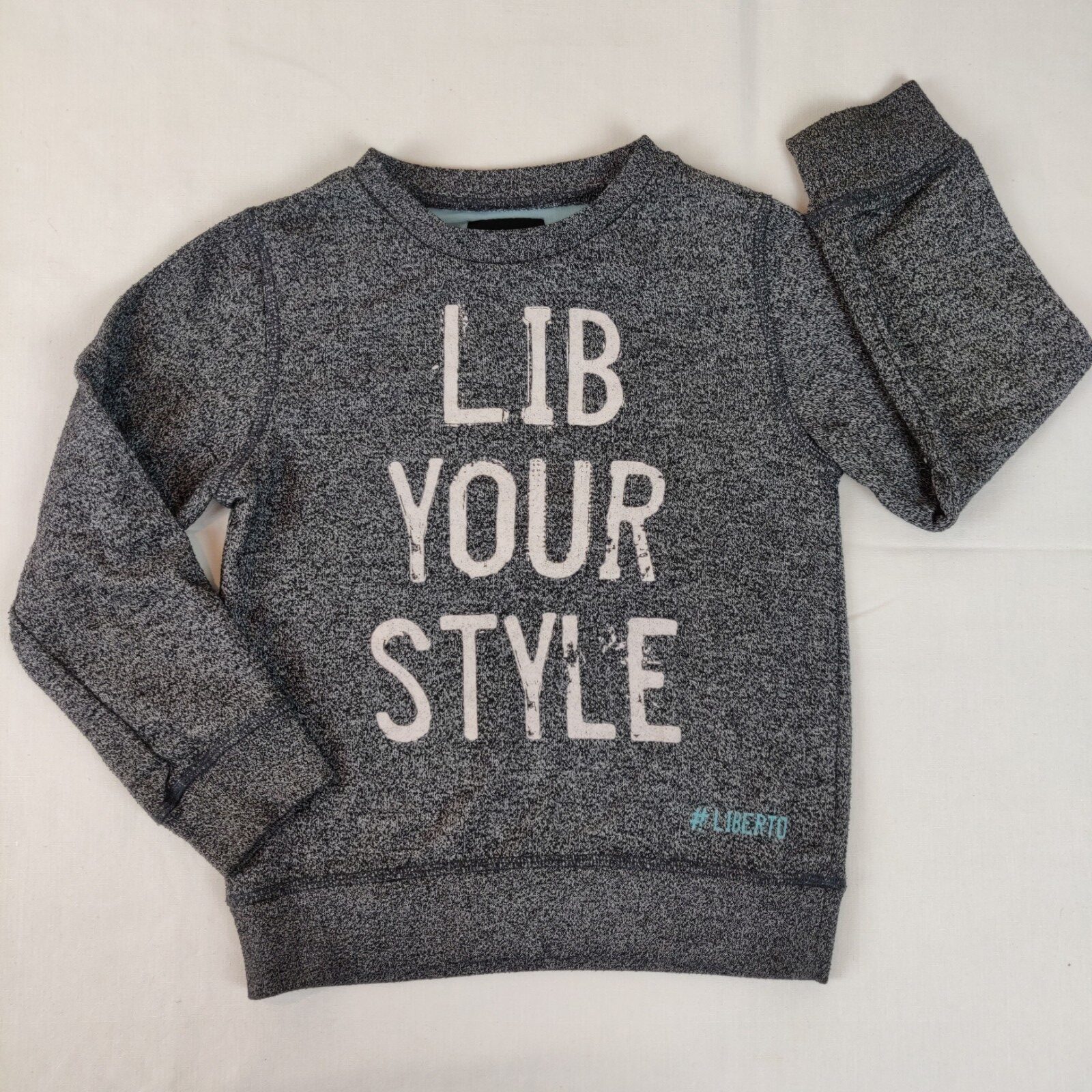 Autres commentaires : Sweat gris foncé chiné avec inscription beige « Lib your style » #Liberto bleu dans le bas. Col, poignets et taille élastiques.