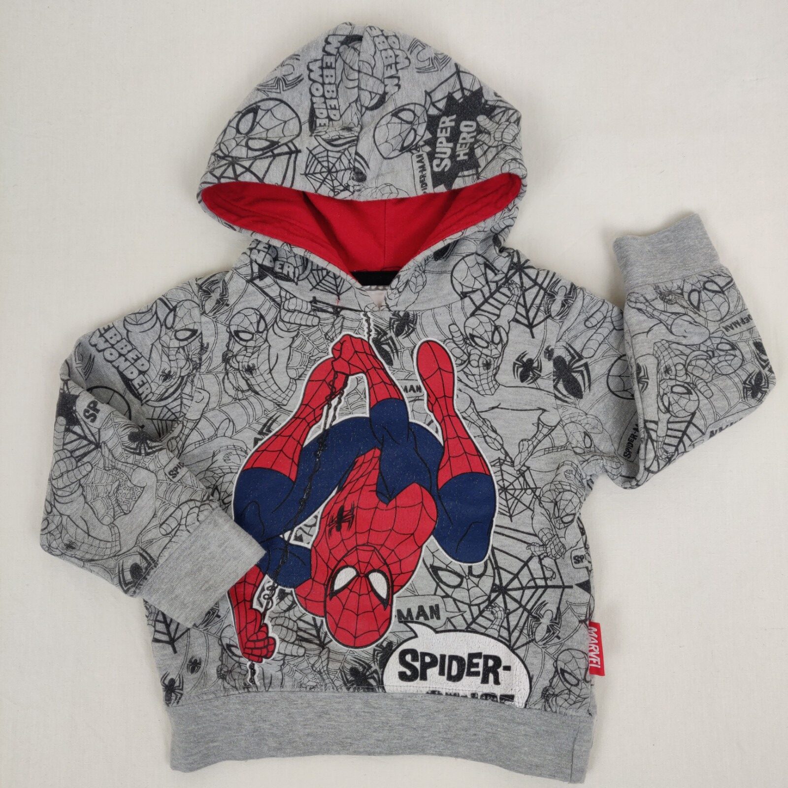 Autres commentaires : 35% coton et doublure 100% coton. Sweat gris motif Spider-man avec capuche et quelques bouloches d’usage.