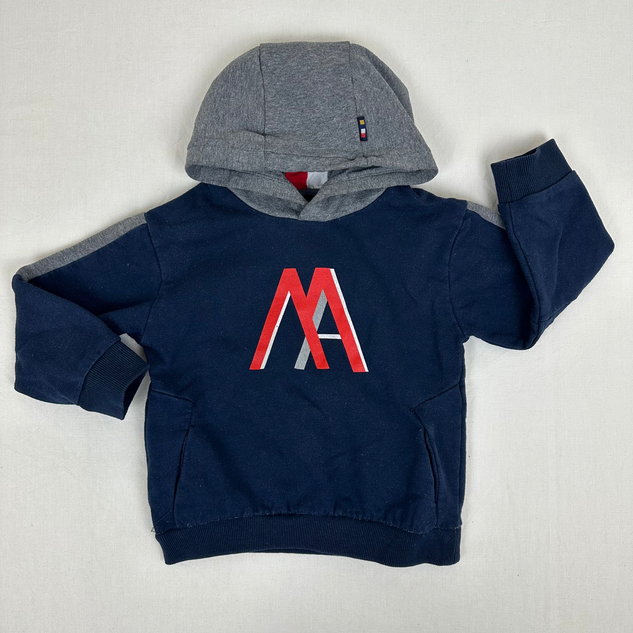 Autres commentaires : 39% polyester et 1% elasthanne. Sweat bleu foncé avec capuche gris et 2 poches latérales.