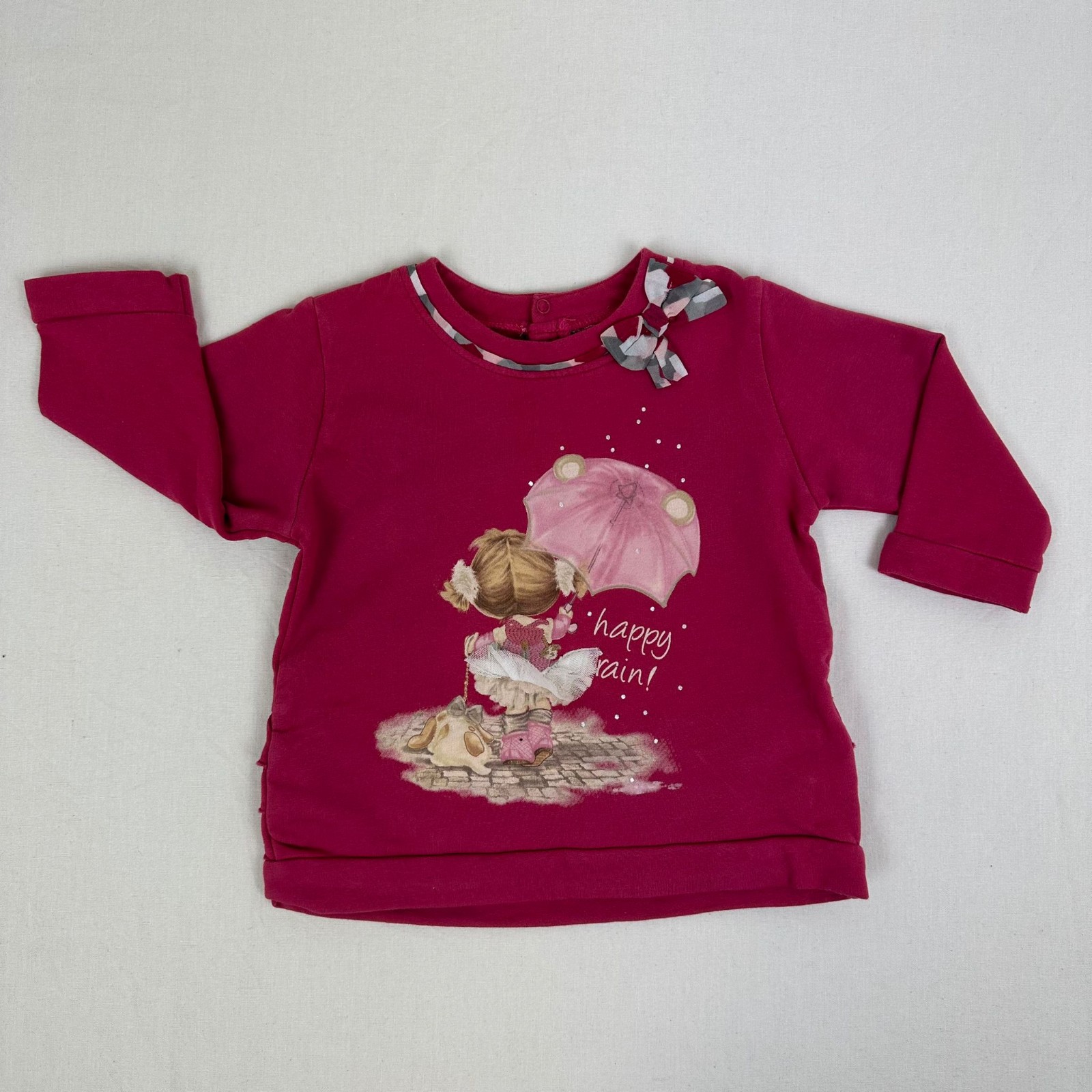 Autres commentaires : Sweat rose sans capuche rose avec motif une petite fille et noeuds au col et une fermeture au dos par boutons pressions.