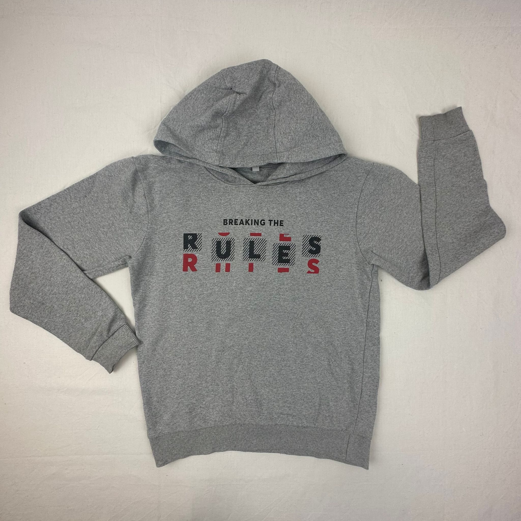 Autres commentaires : 42% polyester. Sweat manches longues gris avec capuche avec motif noir et rouge « RULES » et contient quelques bouloches d’usages.