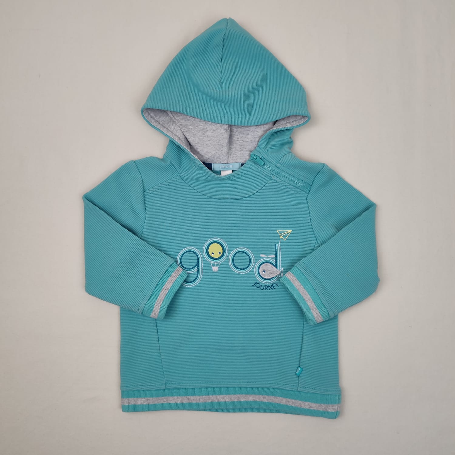 Autres commentaires : 45% coton et 3% élasthanne. Sweat vert d’eau côtelé à capuche, sur le devant inscription »GOOD », fermeture par zip à l’épaule gauche, doublure grise capuche en 100% coton.