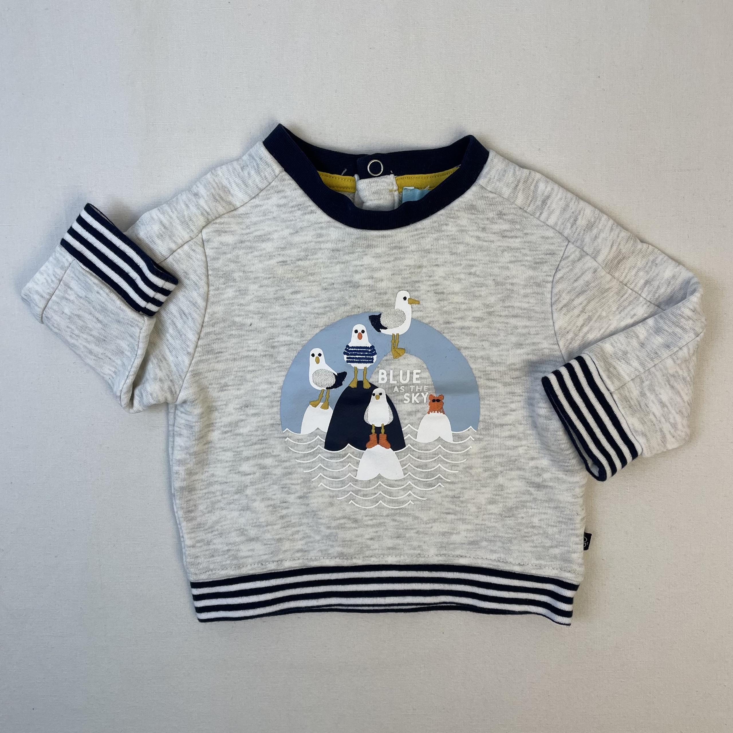 - Sweat couleur grège avec bordures bleu marine et à rayures bleu marine et blanches, devant motifs mouettes avec inscription « Blue as the sky », fermeture en haut du dos par boutons pression.
