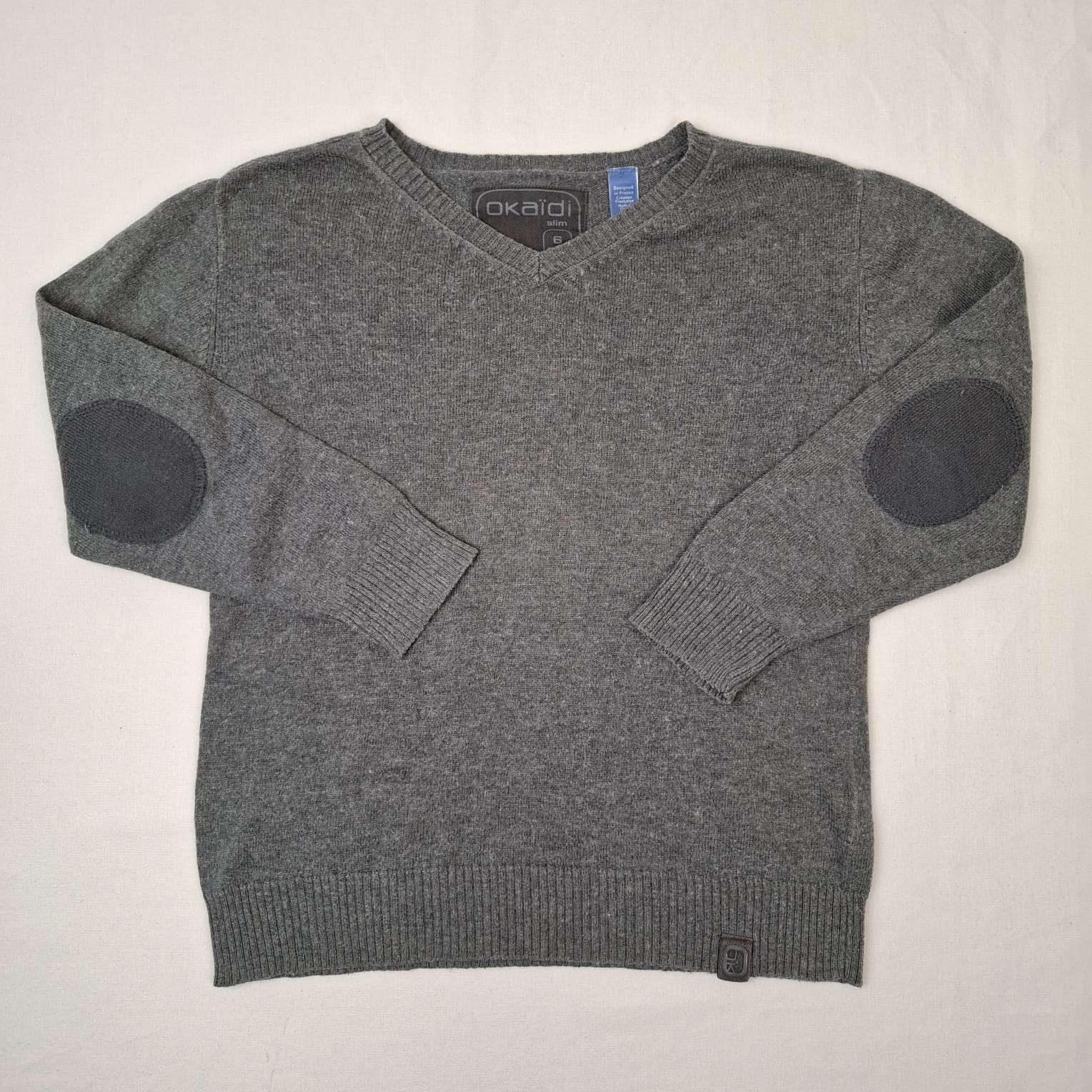 Autres commentaires : 30% polyamide. Sweat gris, col V, finition bord-côte autour de le col, à la base et en bas de manche.