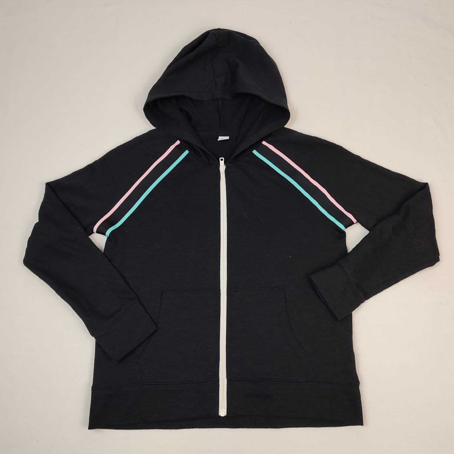 Autres commentaires : 46% Polyester, Sweat à capuche noir, fermeture par zip.