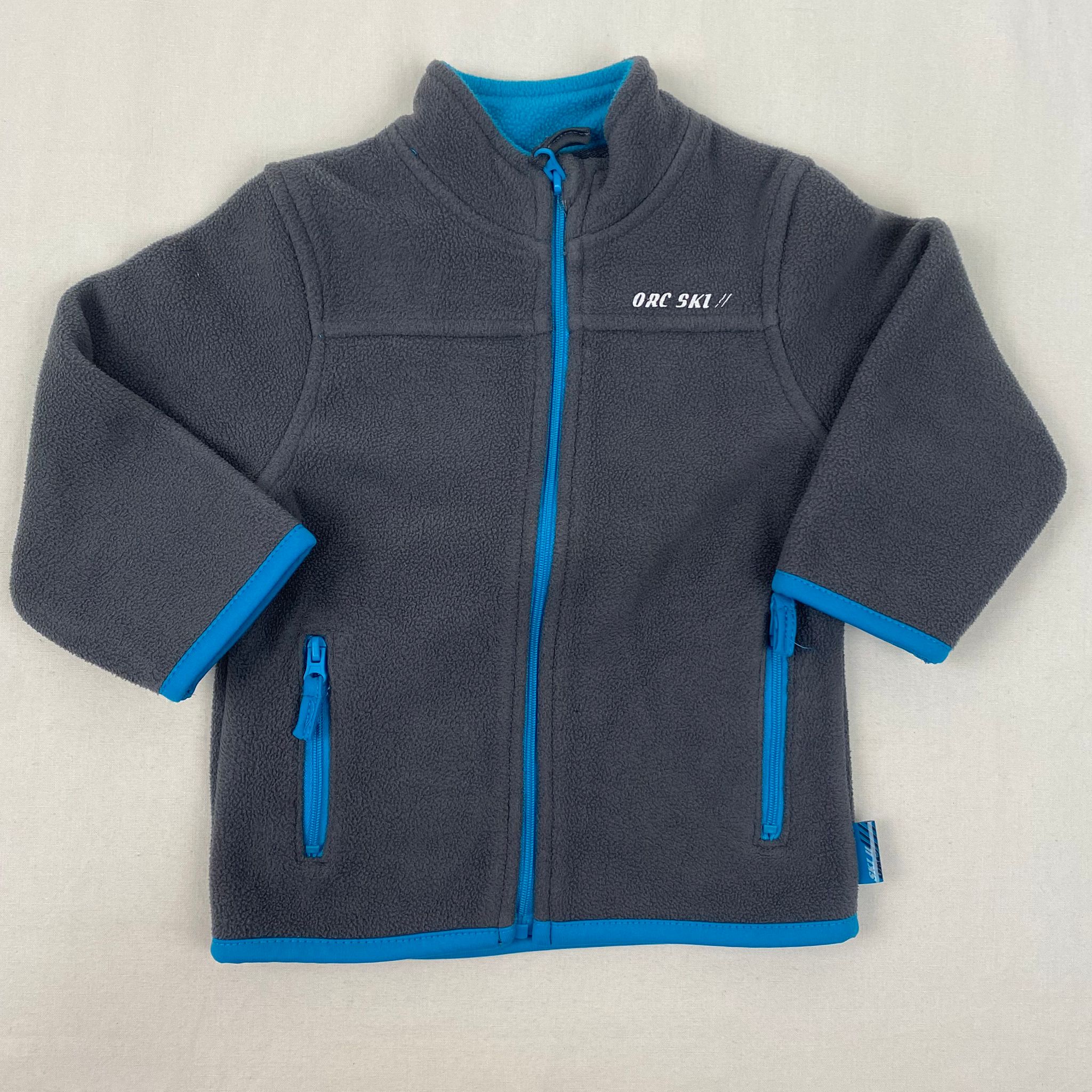 Autres commentaires : Gilet type polaire gris avec inscription « Orc Ski » et fermeture par zip bleu.