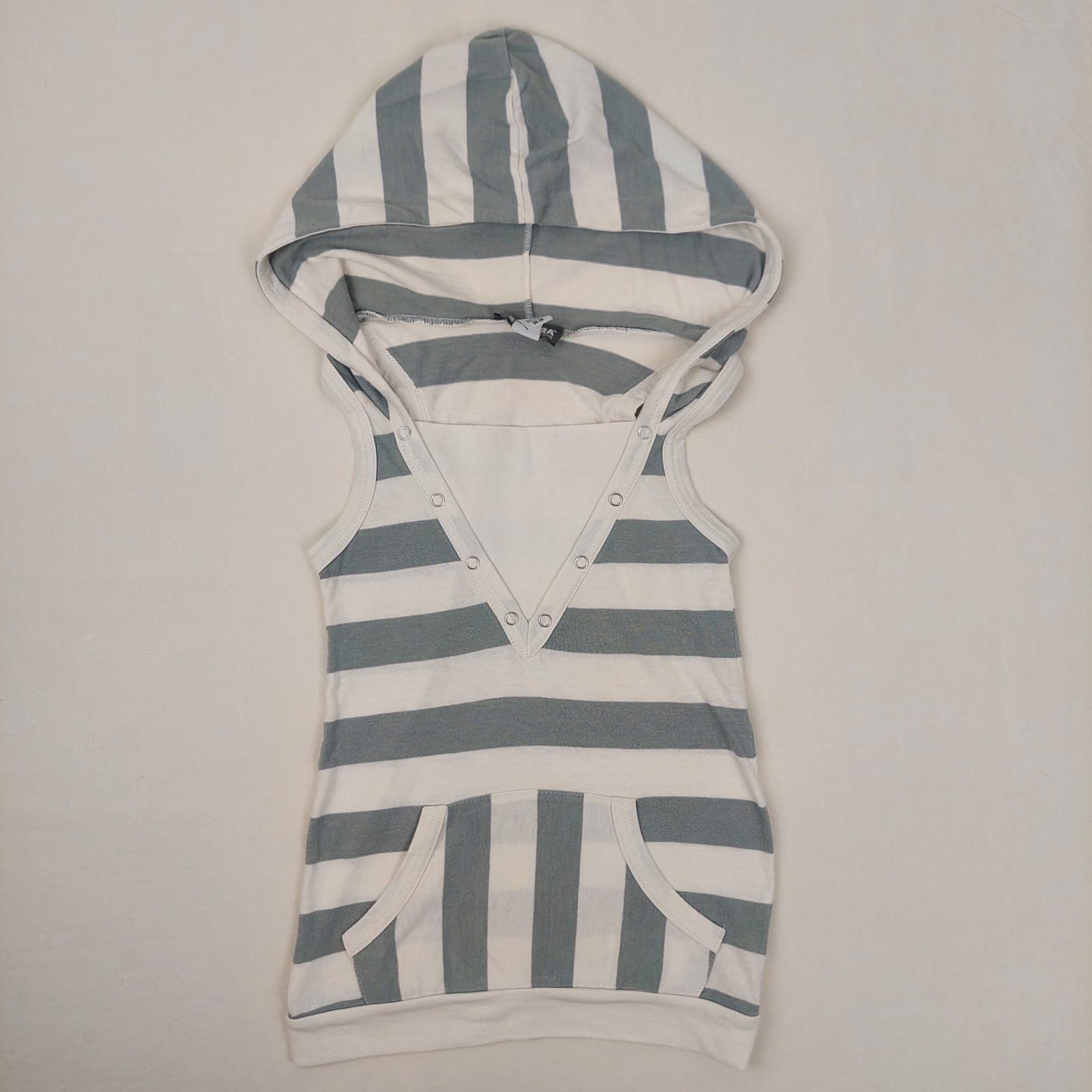 Autres commentaires : 35% polyester, Sweat à capuche sans manche, rayé blanc et gris, tache à l’interieur au niveau du col
