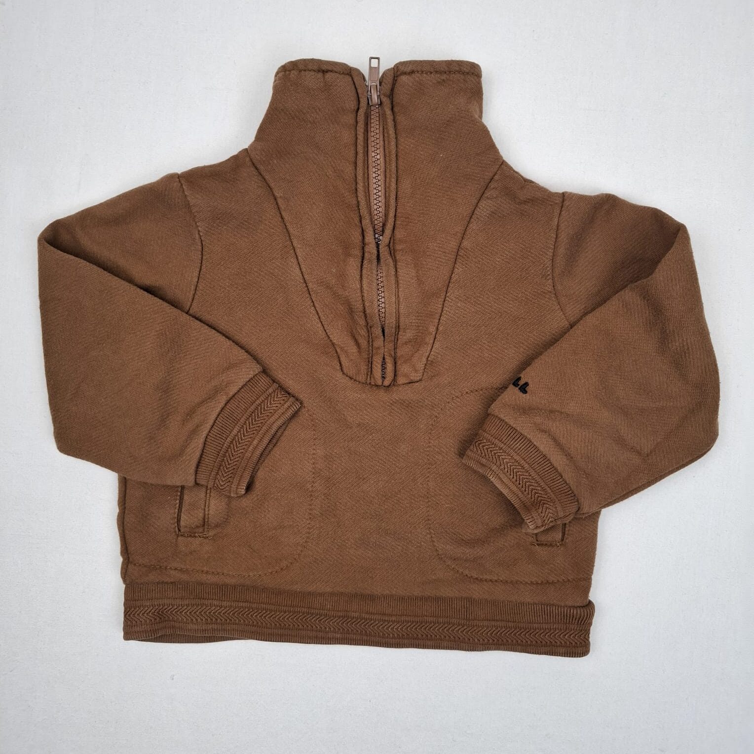 Autres commentaires : Sweat marron Tape à l’oeil, avec poches, col cheminée avec zip, inscription « CHILL » brodée sur la manche gauche du sweat, 28% polyester.