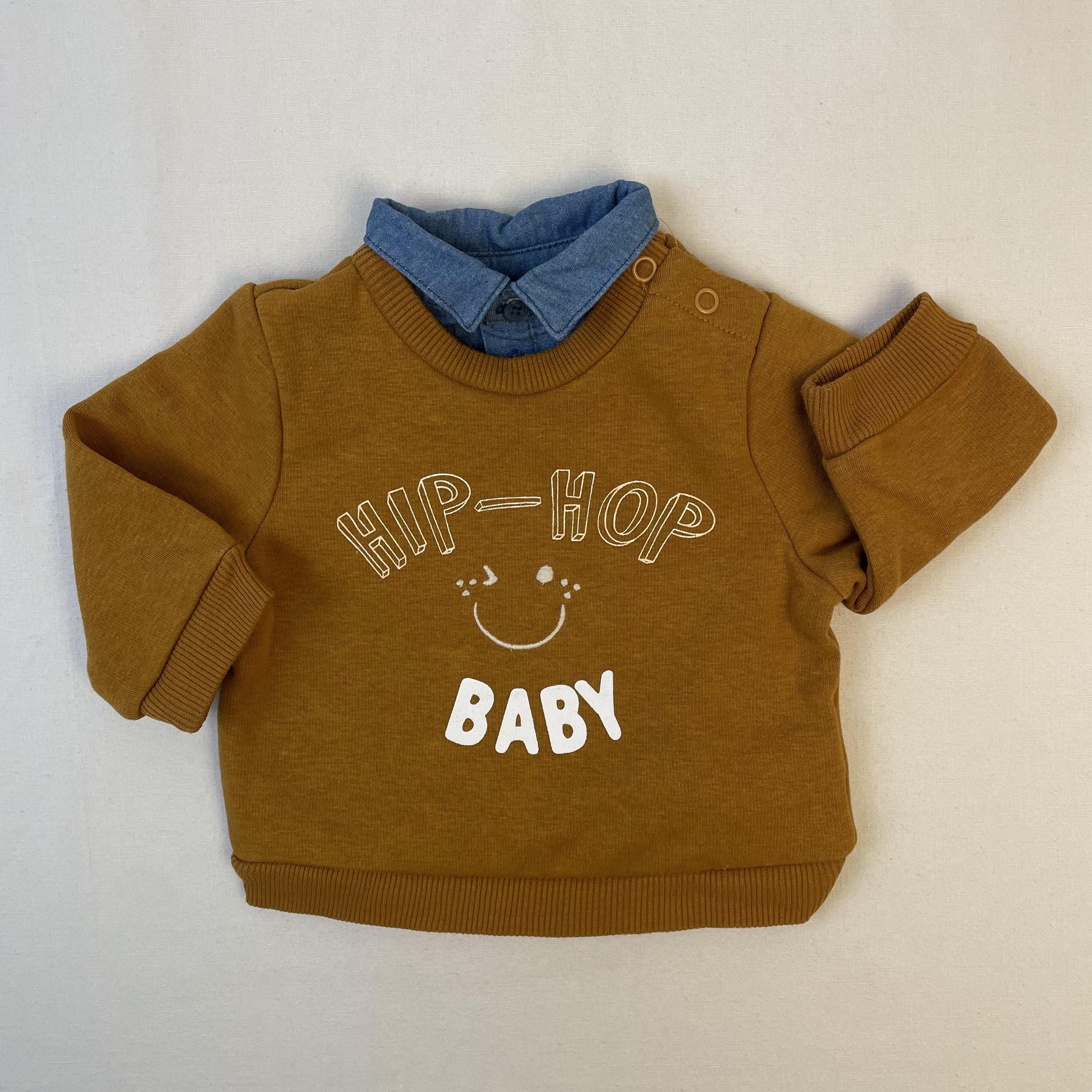 - Sweat couleur tabac, effet superposition avec faux col de chemise en denim bleu, doublure en velours tout doux, devant inscription Hip-Hop Baby.