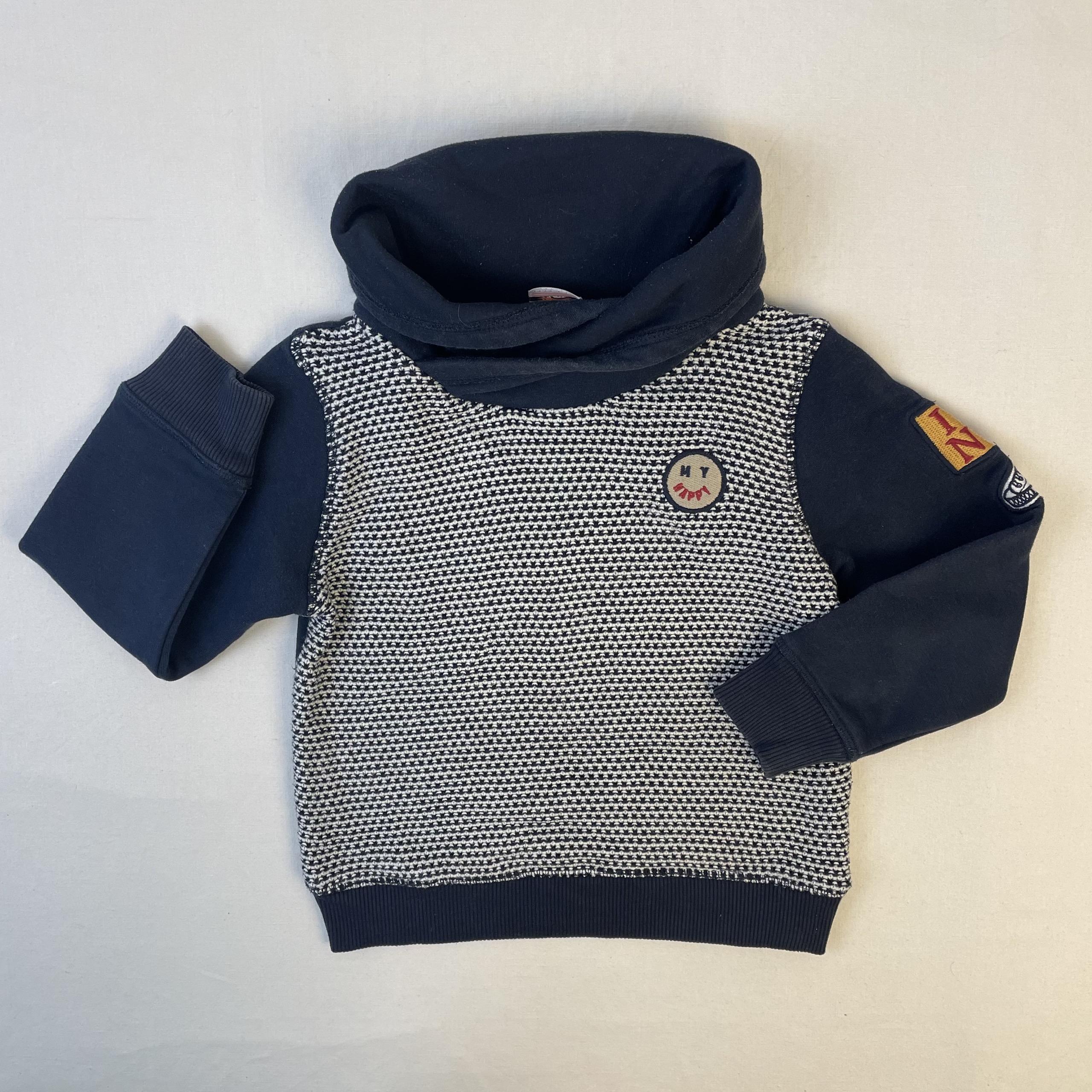 - Manche : 55 % coton, 45 % polyester. Avant : 100 cotons. Sweat bleu marine cache-cou à la place de la capuche