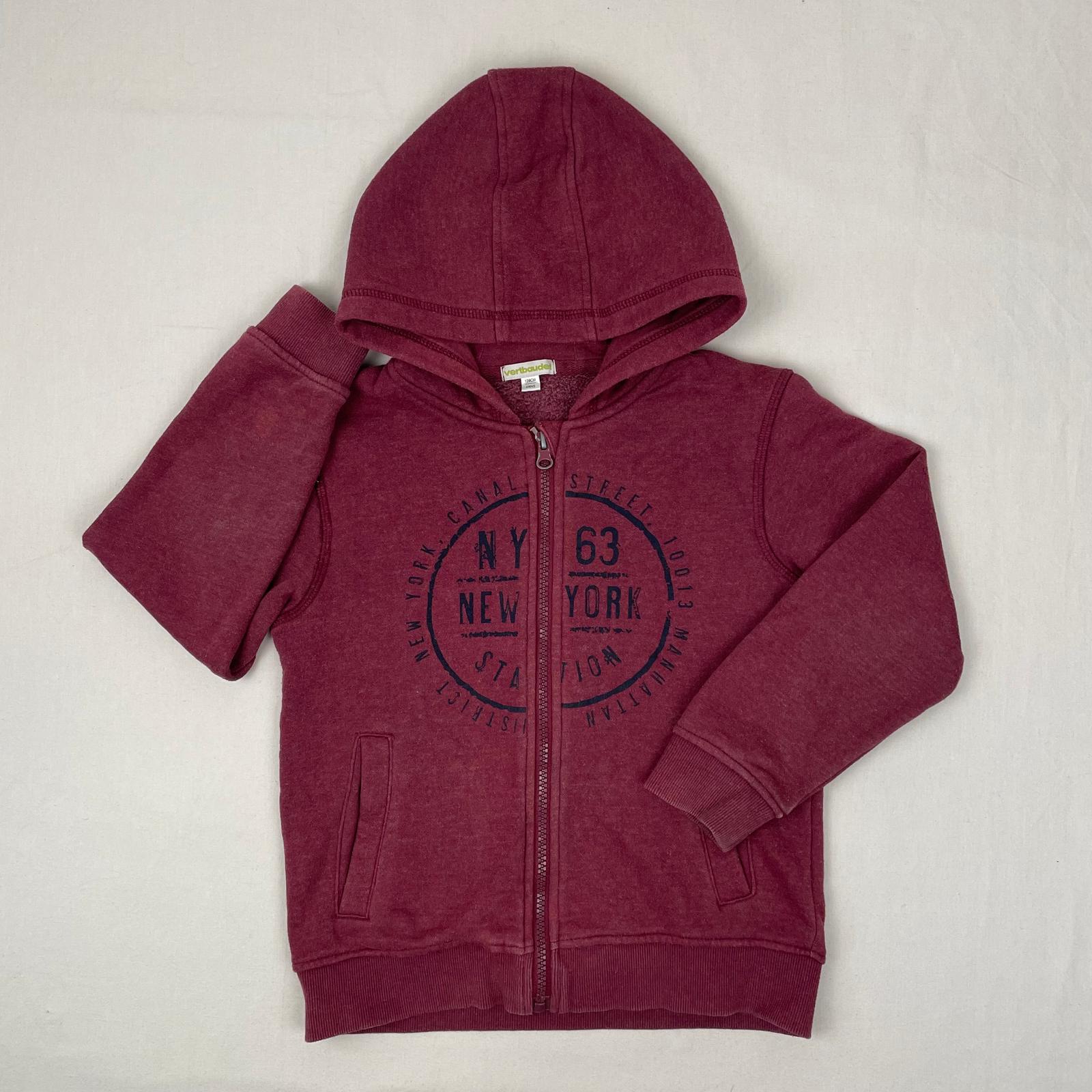 Autres commentaires : Sweat rouge foncé à fermeture éclair avec des poches. Inscription noire devant en cercle « NY 63 New York ».