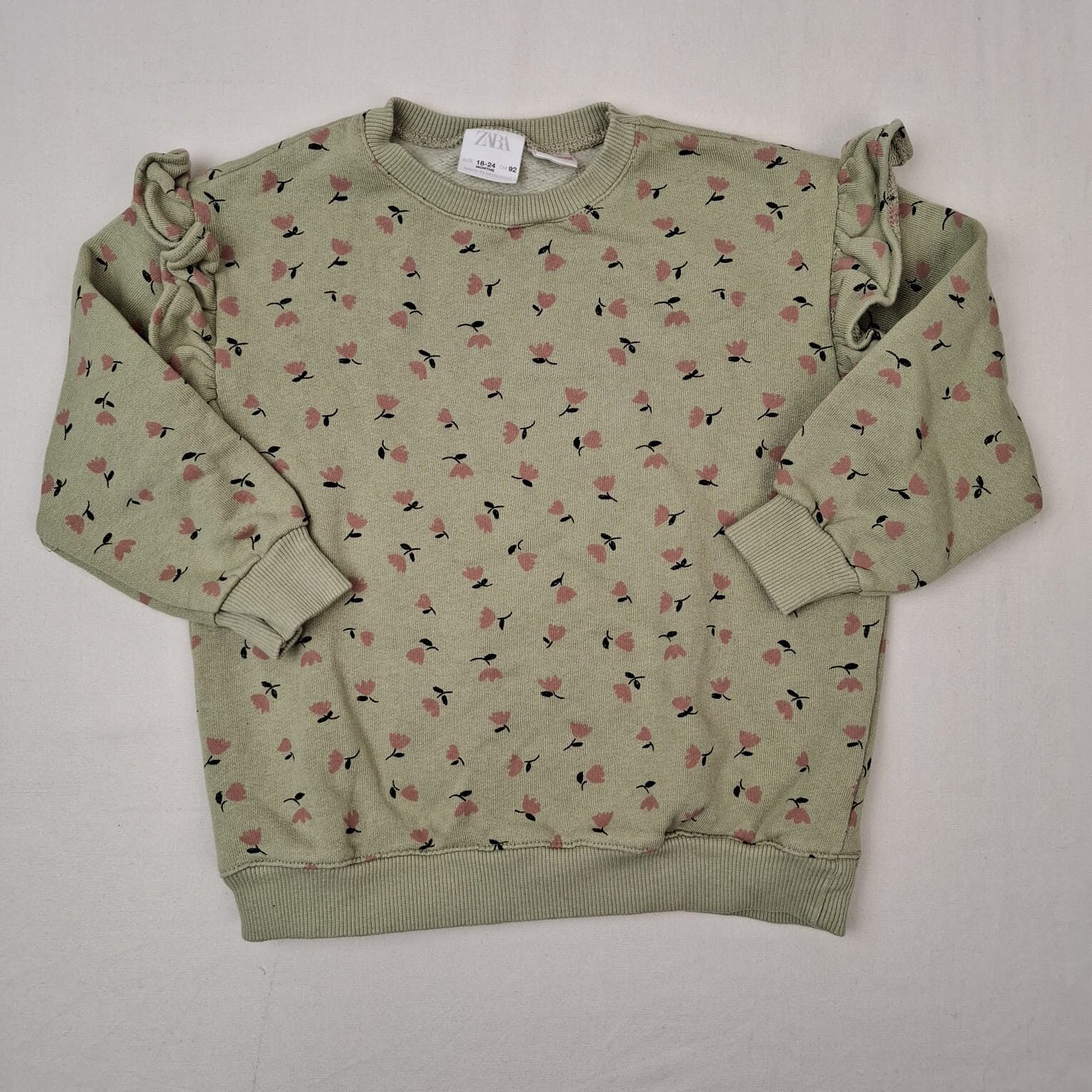 Autres commentaires : 17% polyester. Sweat en polaire kaki, motif fleuri, col rond, finition bord-côte autour de le col, à la base et en bas de manche