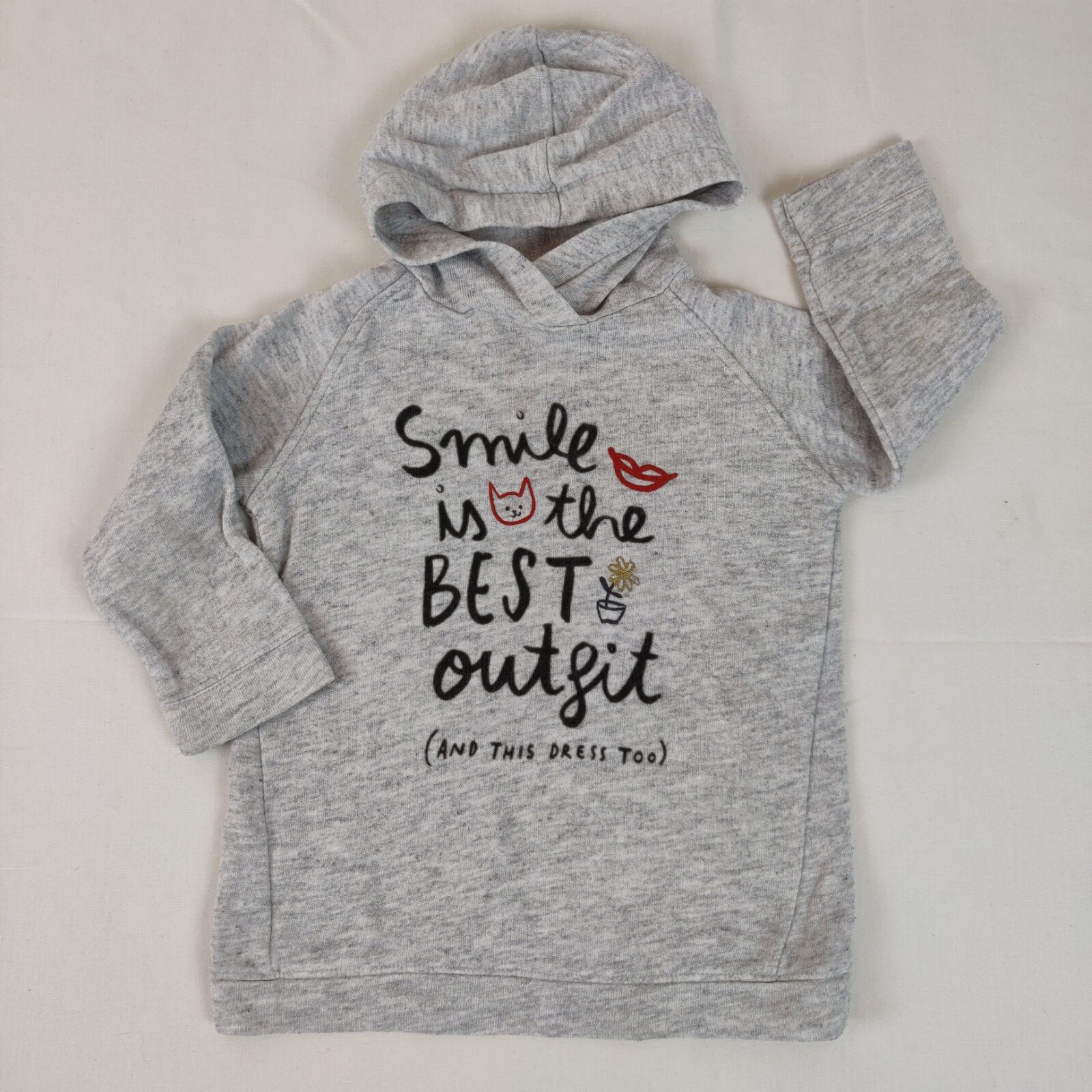 Autres commentaires : Sweat à capuche – gris clair chiné avec inscription « Smile is the best outfit and this dress too ».