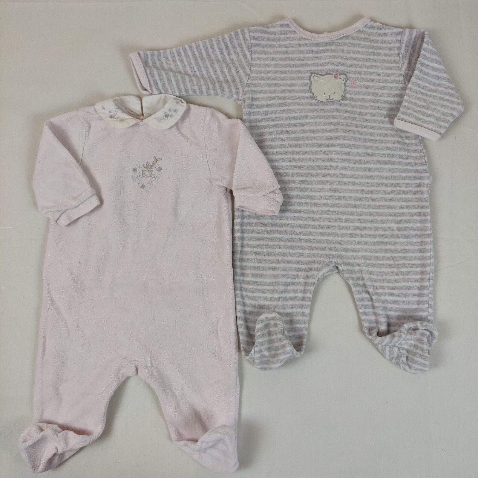 Autres commentaires : 27% polyester. Lot de 2 pyjamas 1 pièce DORS-BIEN à manches longues et à pieds en velours. Ouverture pressionnée au dos. Un pyjama rose avec motif central coeur. Col claudine blanc avec des fleurs brodées. Un pyjama rayé gris et rose avec motif central petite chatte coquette.