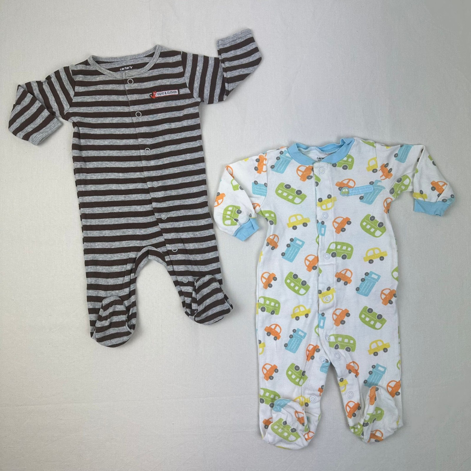 Autres commentaires : 2 pyjamas manches longues avec pieds: un blanc avec motif des petites voitures et une fermeture devant par boutons pressions. L’autre marron avec rayures grises et une fermeture devant par boutons pressions.