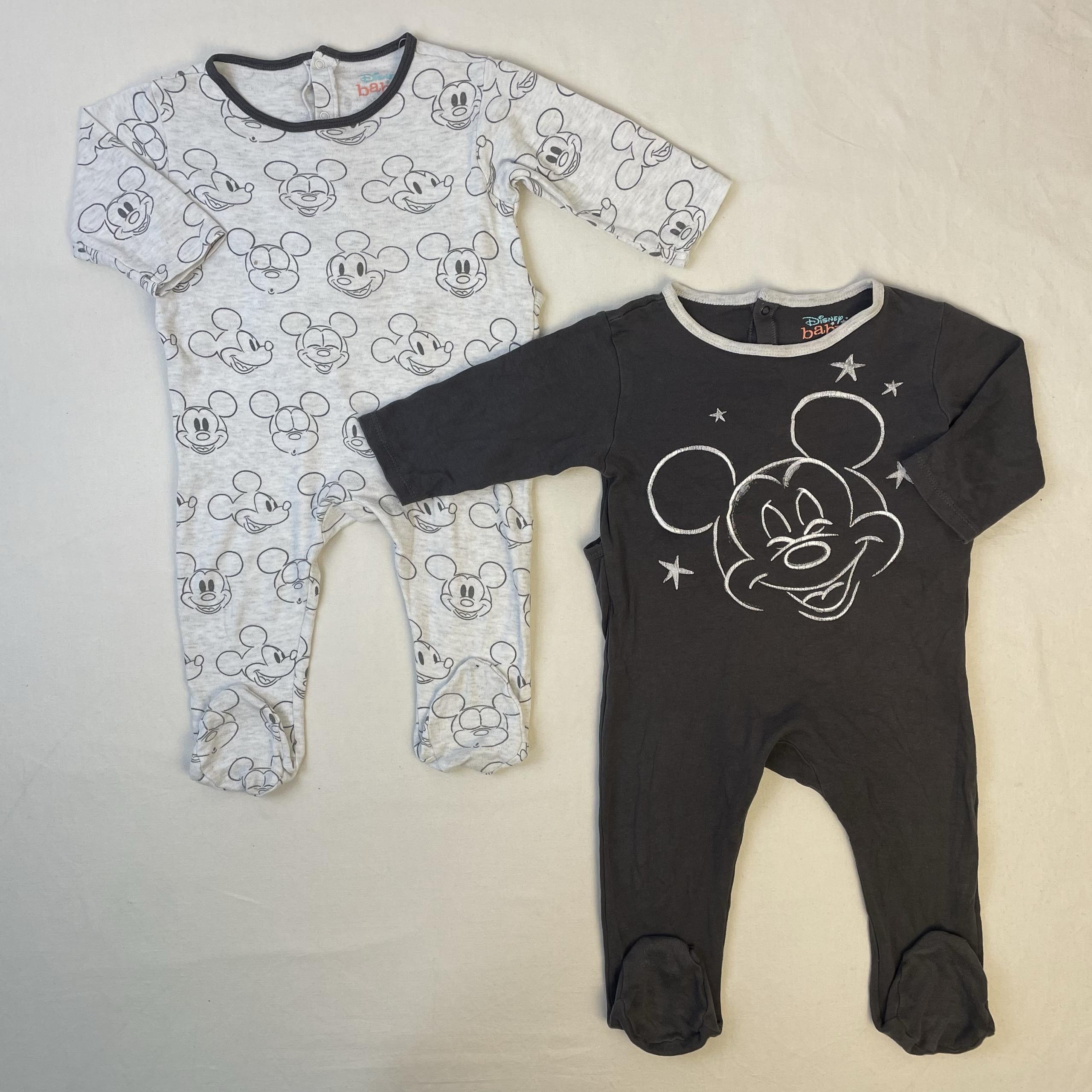 - Lot de 2 pyjamas avec pieds gris clair et gris foncé, fermeture par boutons pressions au dos, motif Mickey Mouse.