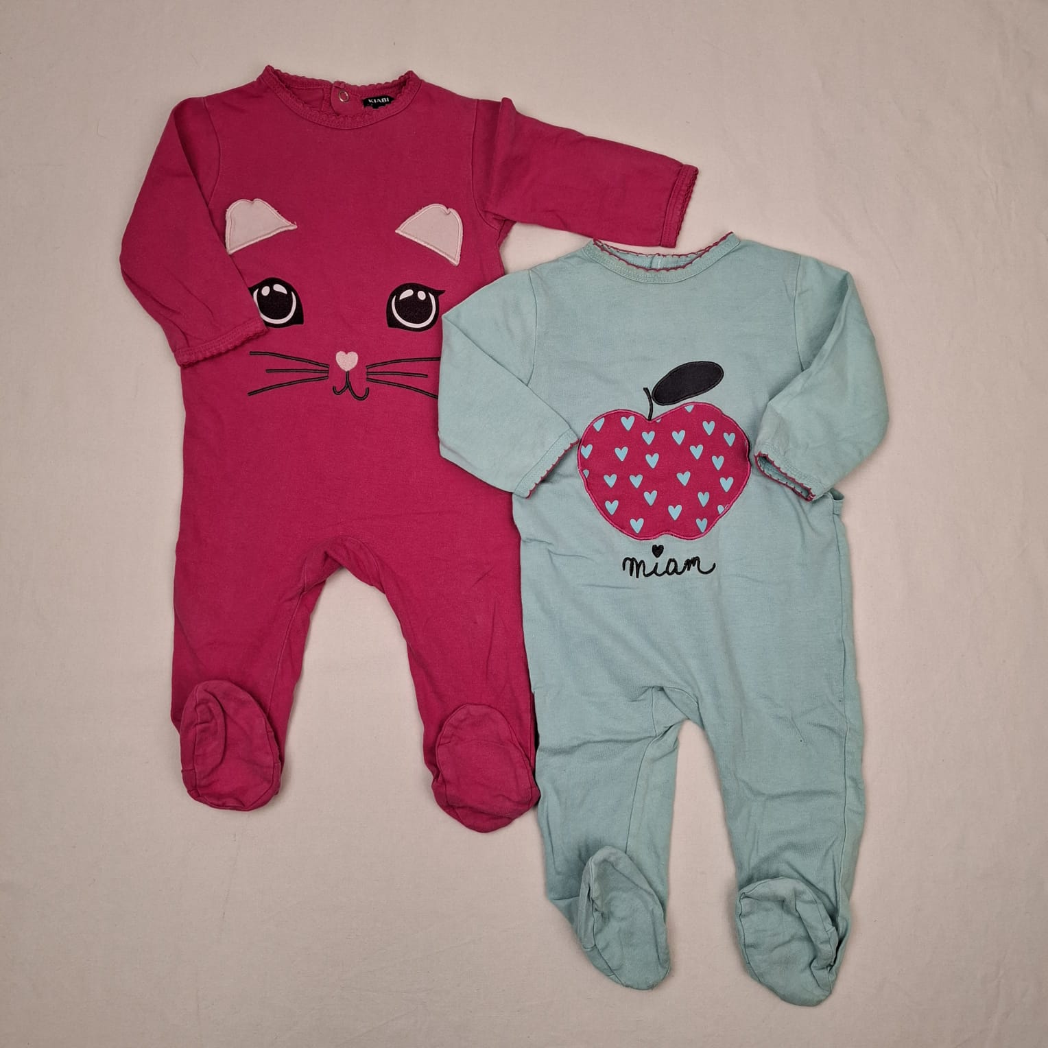 Autres commentaires : Lot de 2 pyjamas 1 pièces à manches longues, col rond, fermeture par boutons pressions : – Un rose avec un motif de chat, – Un bleu avec un motif de pomme rose
