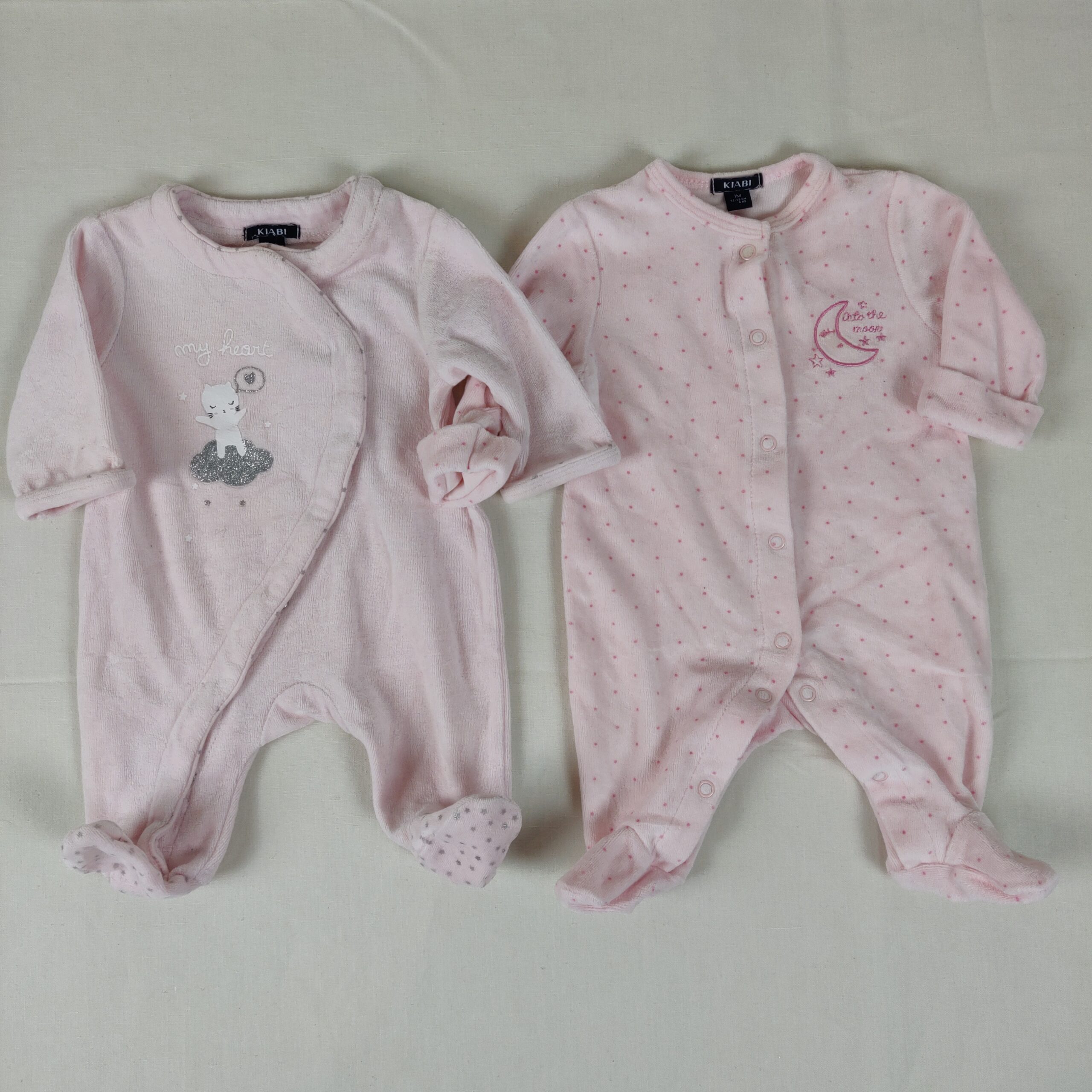 Autres commentaires : 25% polyester. 2 pyjamas en velours rose, le premier motif petit chat blanc sur un nuage argenté et inscription « my heart », fermeture par boutons pression à l’avant en biais, le deuxième avec des pois roses bonbon et une lune brodée au coeur, inscription « onto the moon », fermeture centrale à l’avant par boutons pression.