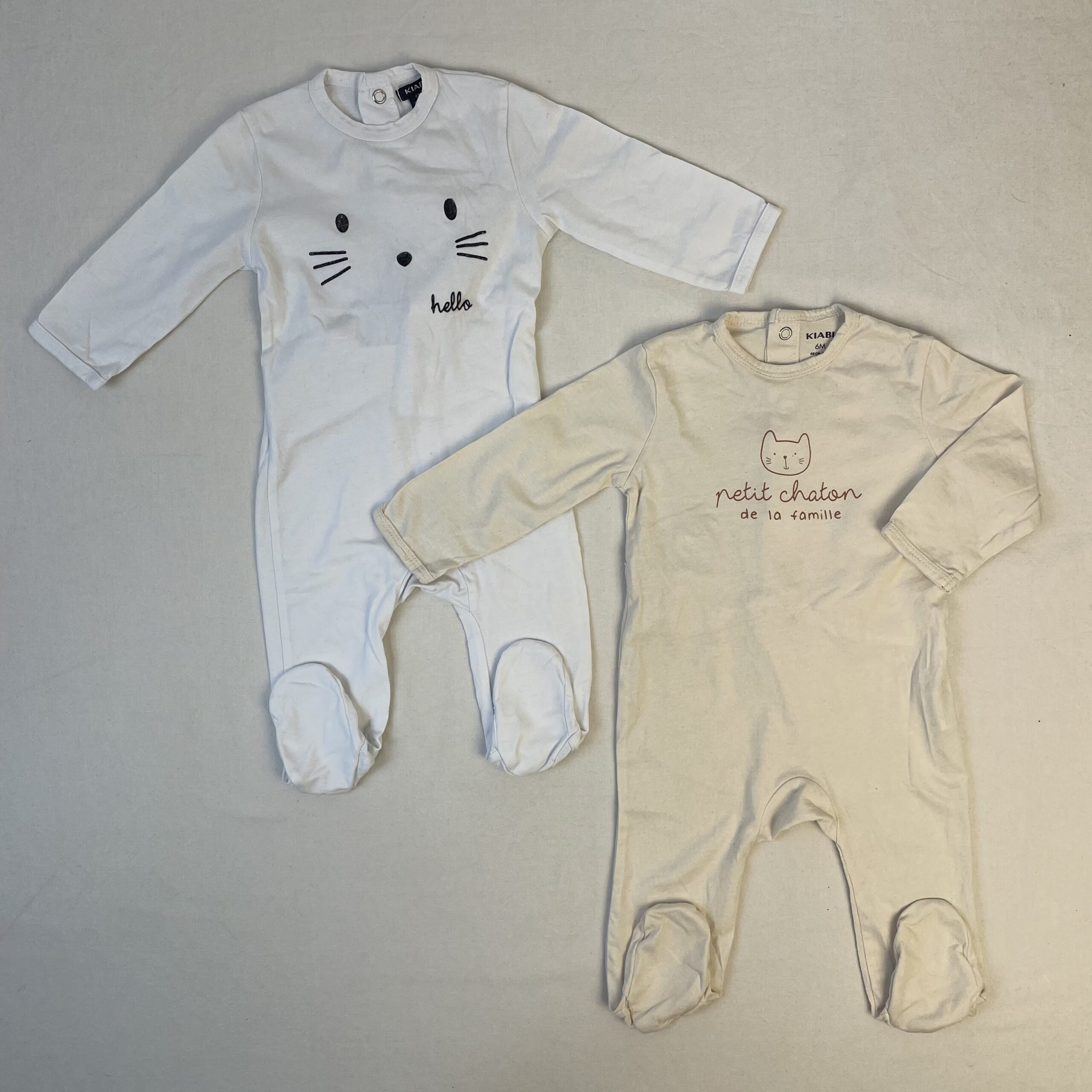 • Lot de 2 pyjamas dors-bien, fermeture au dos par boutons pression : – un blanc avec, devant, une frimousse de chat et l’inscription « hello ». – un couleur crème avec devant une petite tête de chat avec inscription en marron clair « Petit chaton de la famille ».