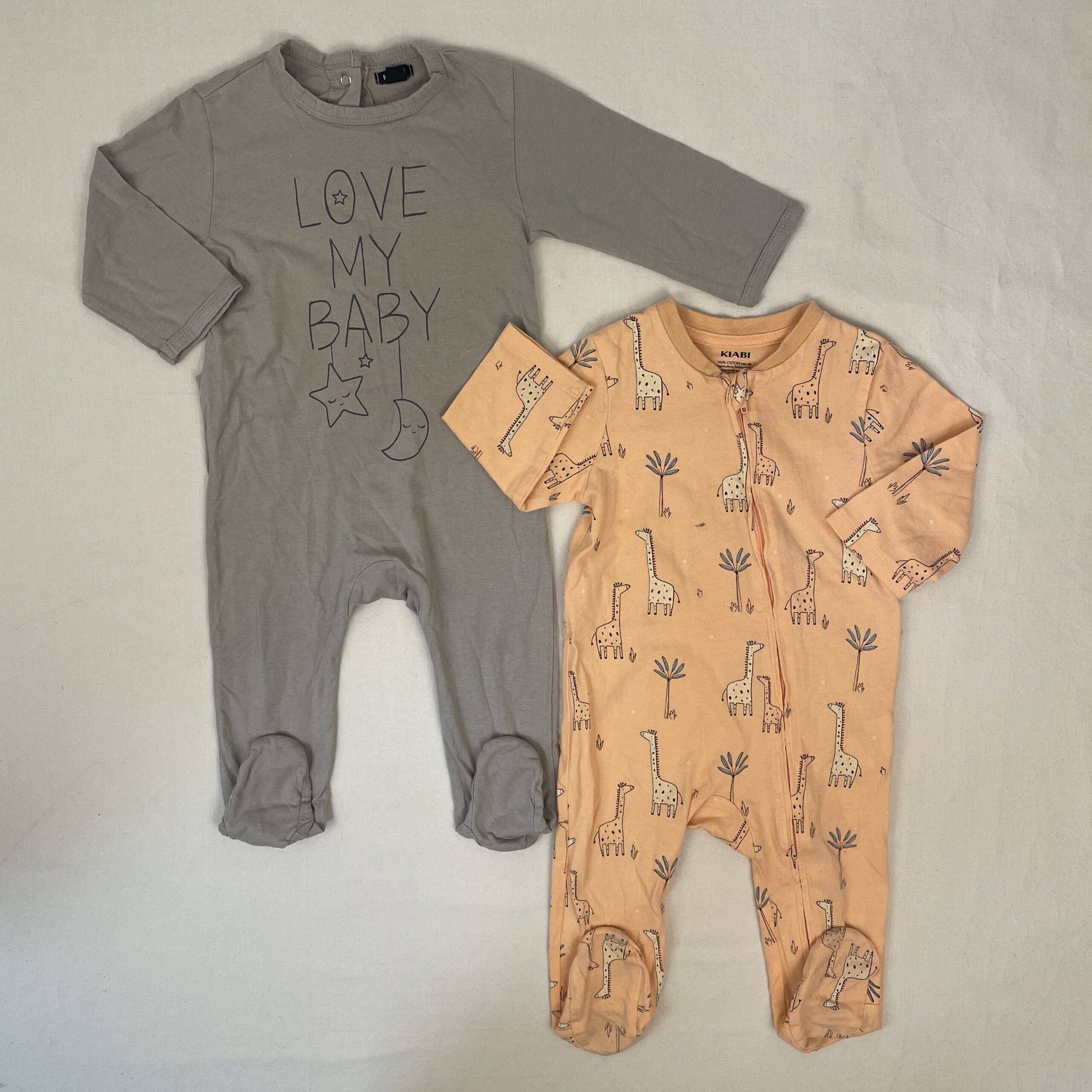 - Lot de 2 pyjamas avec pied: 1 pêche, fermeture par zip devant, motif girafes et palmiers; 2 gris, fermeture par boutons pression au dos, devant inscription » Love my baby ».