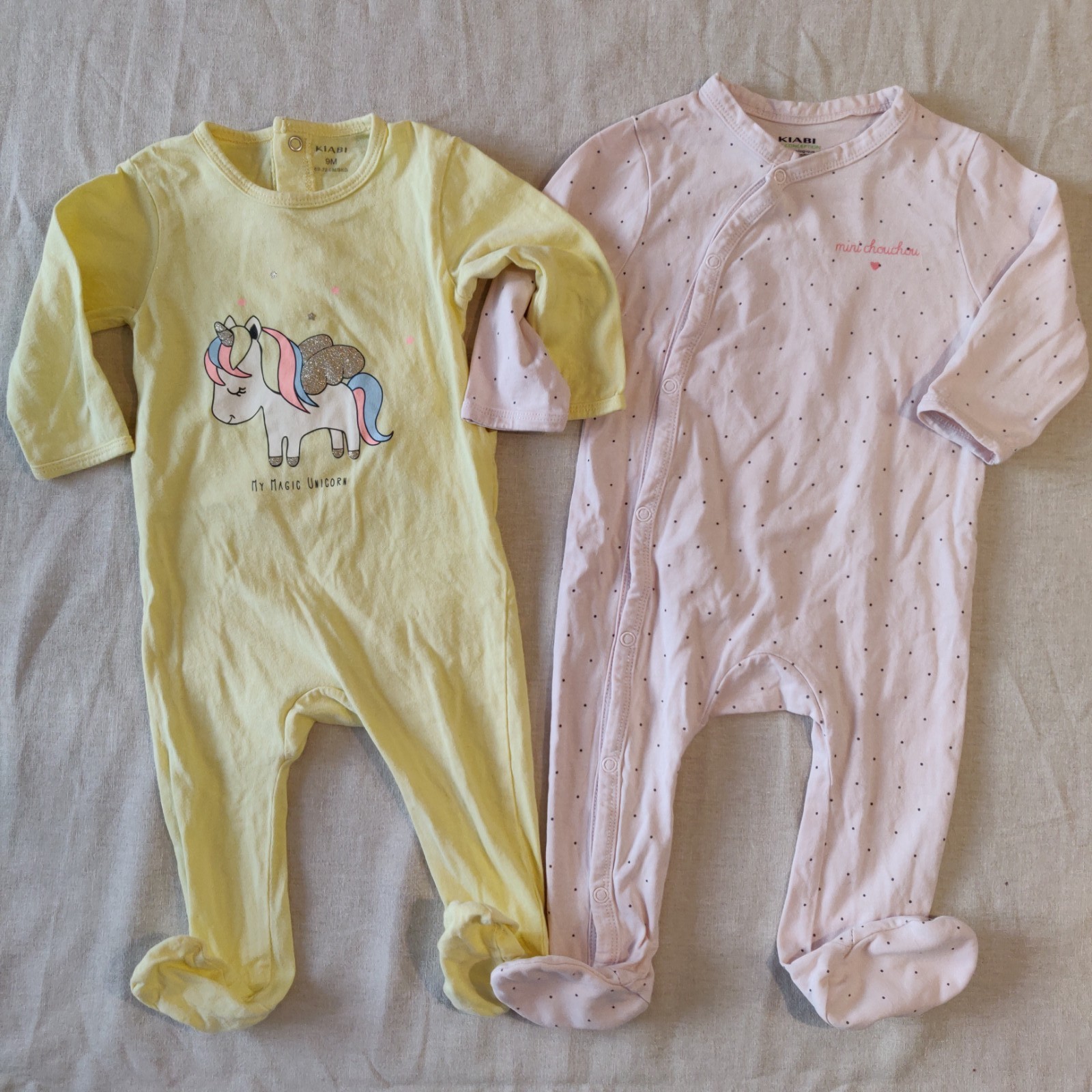 Autres commentaires : 2 pyjamas en jersey de coton. L’un est rose pâle à pois noirs, en coton biologique, fermeture à l’avant par boutons pression sur le côté, avec l’inscription « mini chouchou », l’autre est jaune avec l’inscription « my magic unicorn » et un dessin de licorne aux ailes dorées, fermeture au dos. Quelques bouloches aux mollets.