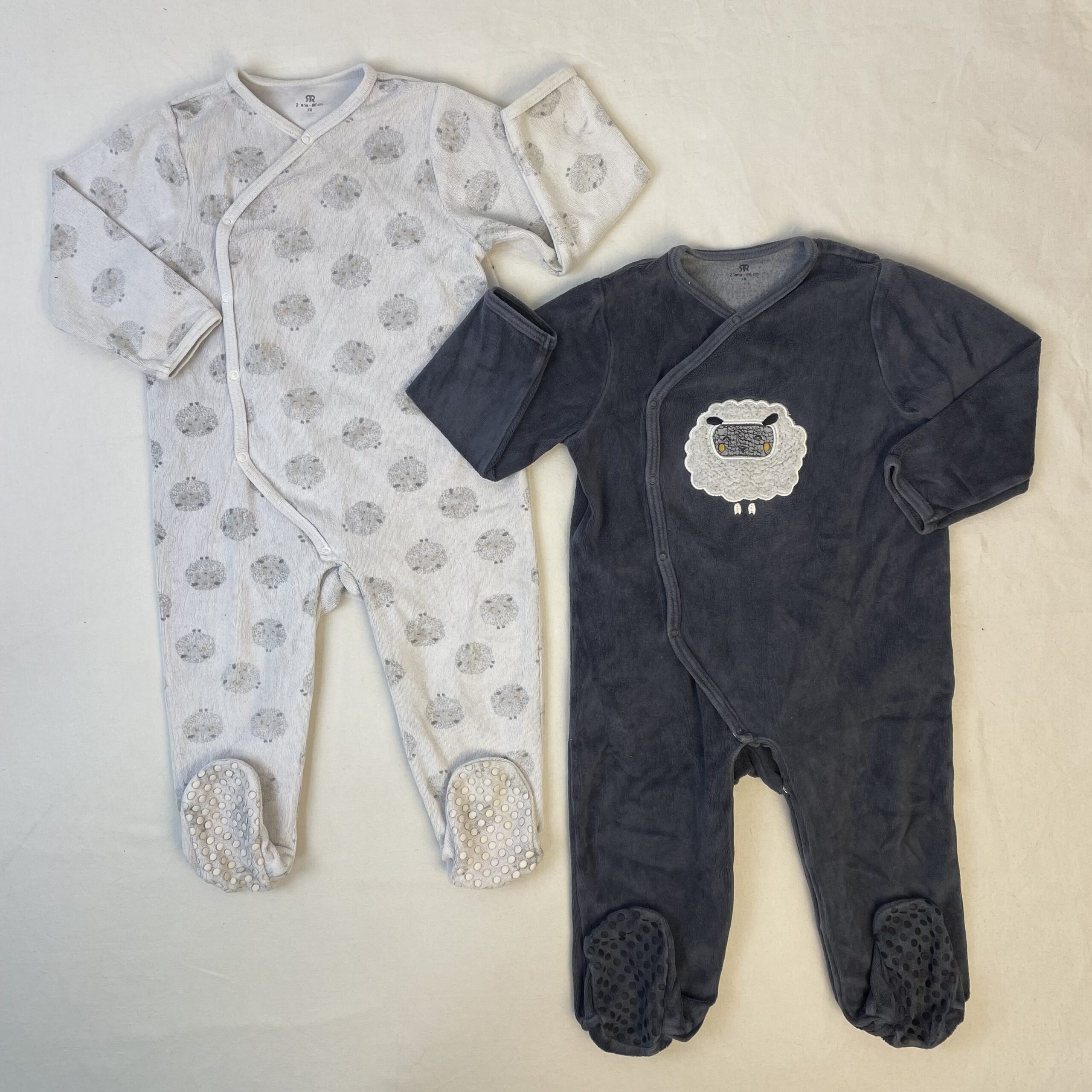- Lot de 2 pyjamas avec pieds en velours, fermeture par boutons pressions devant et entre les jambes: gris clair, motif parsemé les moutons et gris foncé, motif mouton blanc devant.