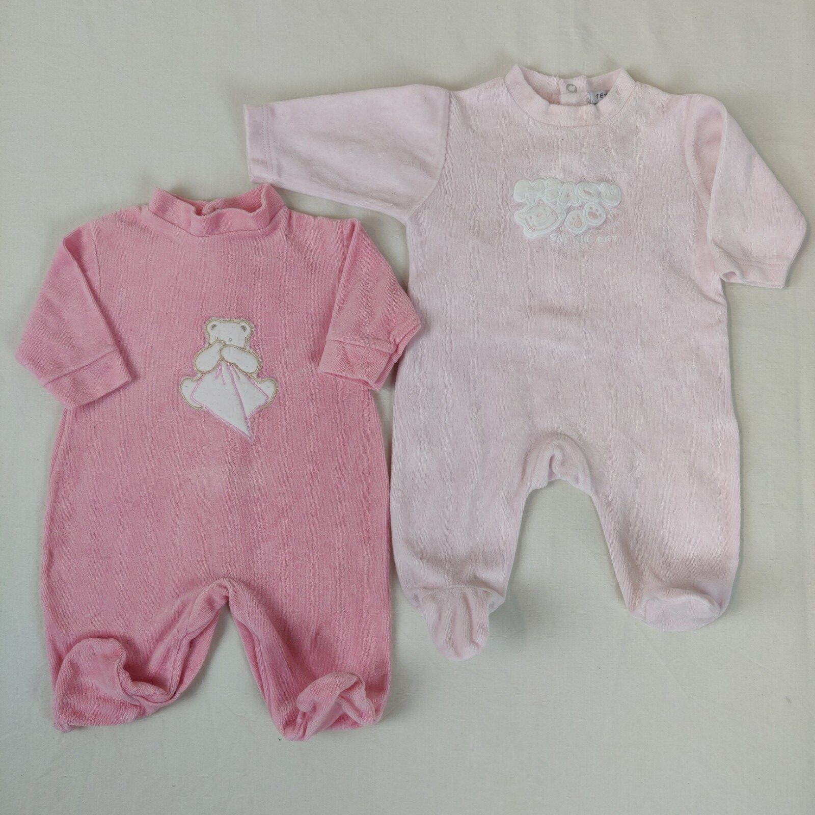 Autres commentaires : 26% polyester. Lot de 2 pyjamas 1 pièce DORS-BIEN à manches longues et à pieds en velours rose. Ouverture pressionnée au dos. Un pyjama Tex avec motif piqué petit chat accompagné de l’inscription « Miaou say the cat ». Un pyjama sans marque avec motif central piqué petit ourson en peluche avec son doudou.