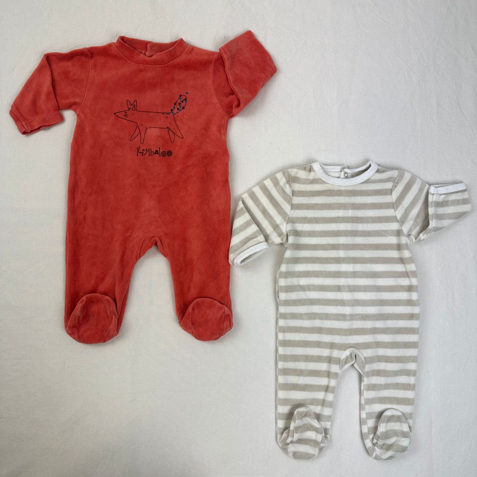 Autres commentaires : 2 pyjamas une piéce manches longues en velours orange de Kimbaloo et blanc à rayuress marron de Vertbaudet avec motif centrale un loup.