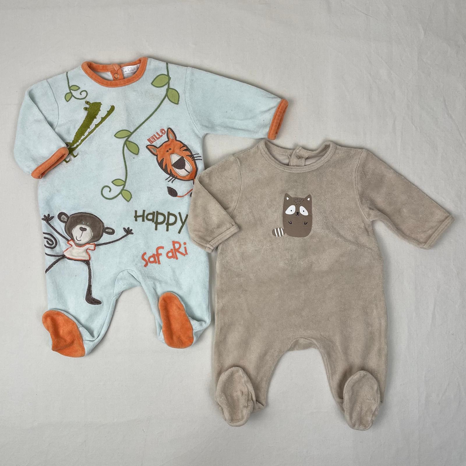 Autres commentaires : Lot de 2 pyjamas à pieds en velours avec boutons pression dans le dos et aux fesses : -1 beige avec un raton laveur avec élastiques aux chevilles ; -1 bleu à imprimés thème jungle et des inscriptions « Hello », et « Happy Safari » devant.