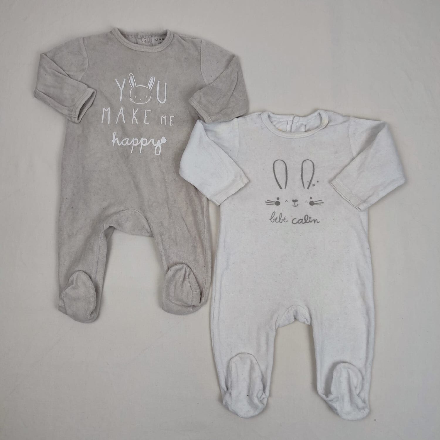 Autres commentaires : Lot de 2 pyjamas dors-bien en velours avec pieds, fermeture par boutons pression à l’arrière : – un beige KIABI, inscription en blanc ‘You make me happy », 81% coton et 19% polyester. – un blanc Pat & Ripaton, motif lapin avec inscription « Bébé câlins » en gris, 75% coton et 25% polyester. Petit défaut : petite tache sur le côté du col. Nivveau réduit de Fraise à Myrtille