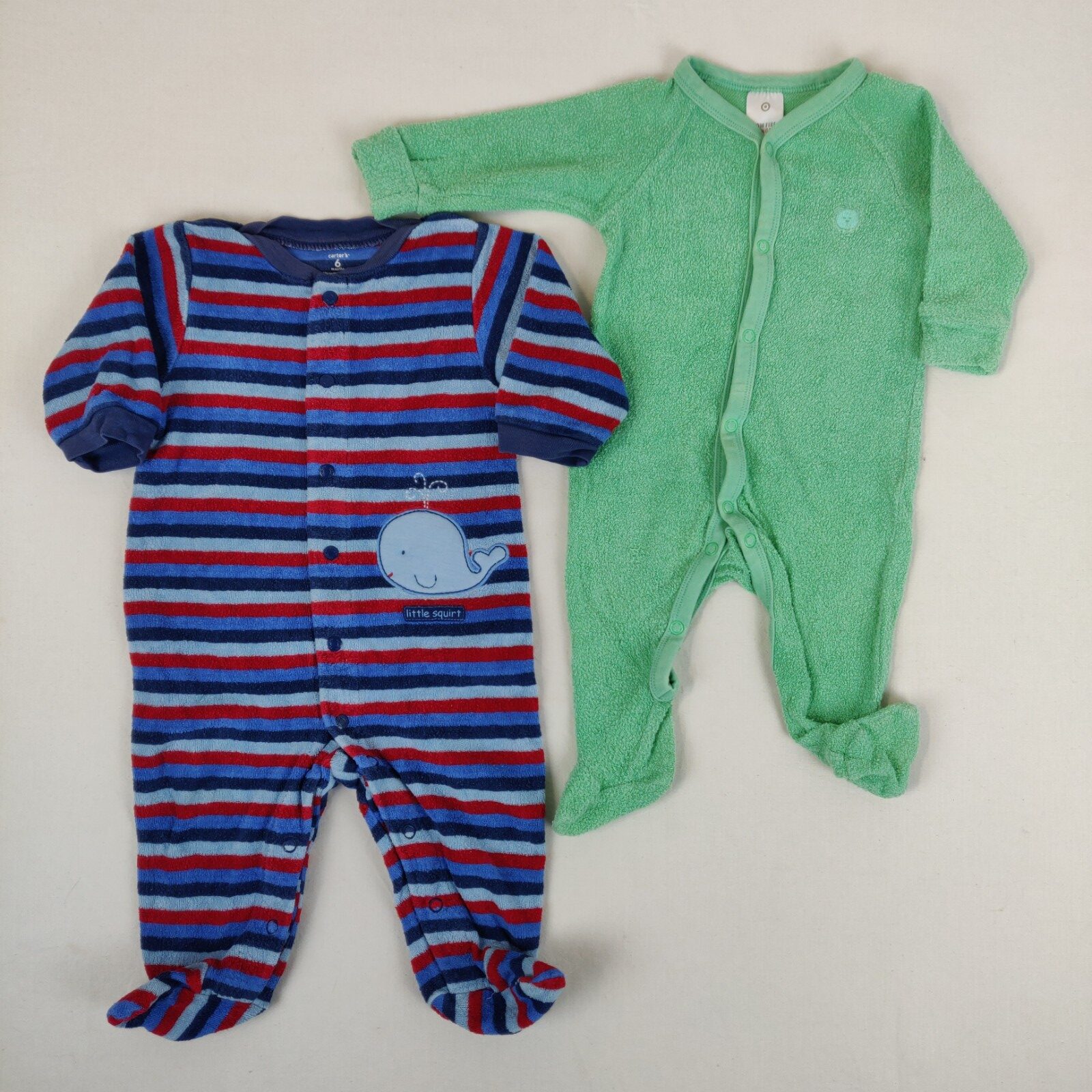 Autres commentaires : 2 pyjamas 1 piéce : l’un de couleur vert avec fermeture par des bouton pressions et contient du coton et nylon . L’autre de couleur bleu avec des rayures multicolores , fermeture par des boutons pressions et tissu en éponge .