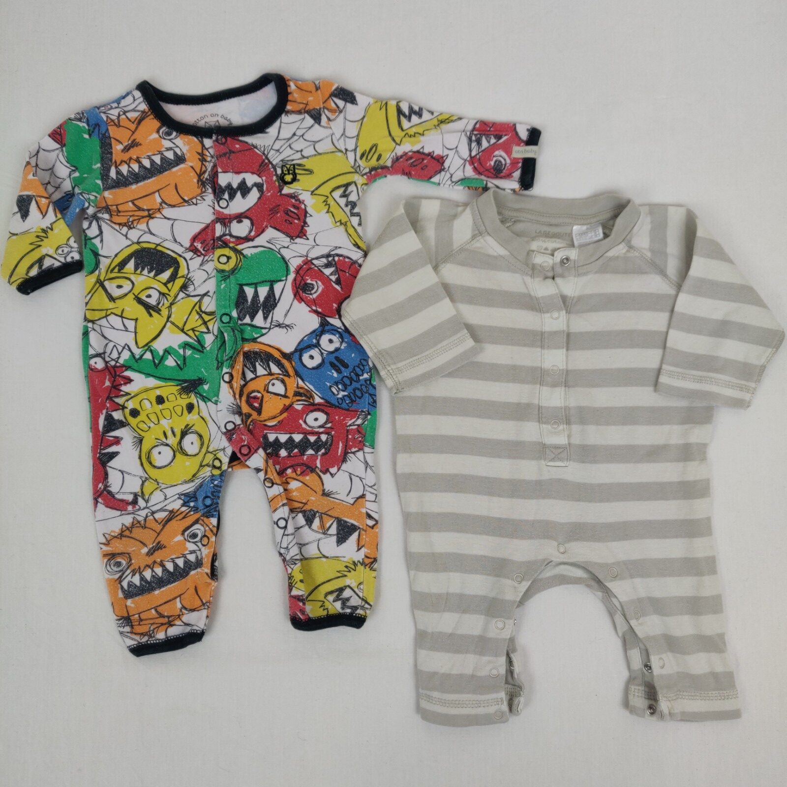 Autres commentaires : 2 pyjamas un pi-ce sans pieds. 1 La Redoute à rayures beige et écru en très bon état, 1 Cotton On Baby à motif monstres rigolos multicolores, quelques bouloches d’usage.