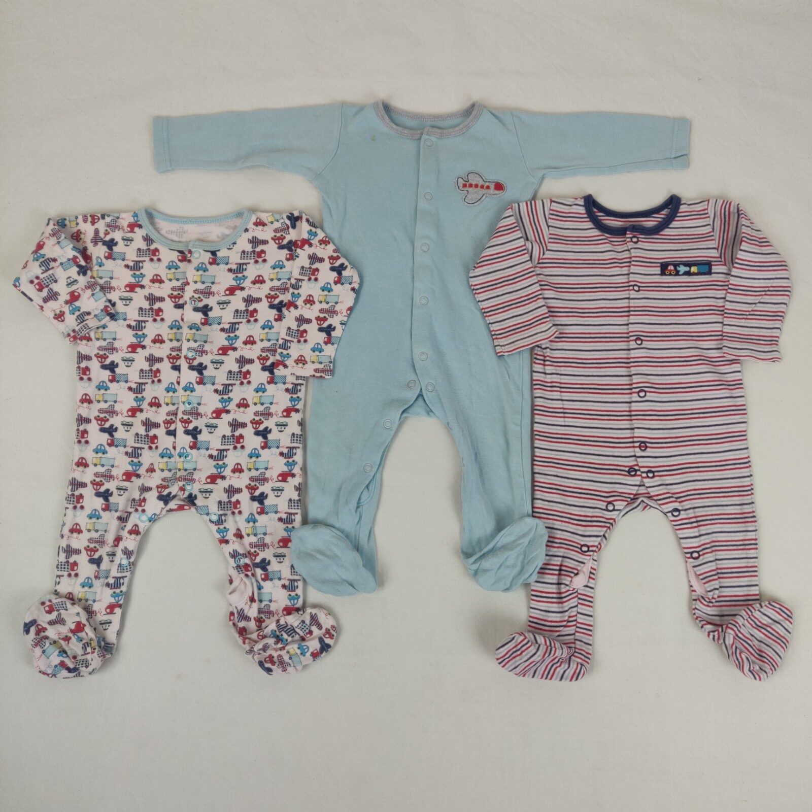 Autres commentaires : 2 pyjama 1 pièce : l’un à rayures horrizontales et l’autre avec des dessins multicolores. 1 pyjama bleu offert avec une petite tache orangée et fermeture à bouton pression à l’avant pour les 3 pyjamas.